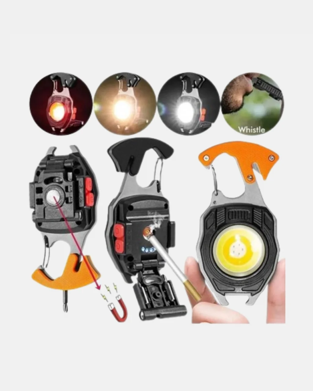Bu mini çok amaçlı fener, birden fazla işlevi bir arada sunarak günlük yaşamı kolaylaştırır. Güçlü LED ışığı sayesinde gece yürüyüşlerinde, araç tamirlerinde veya kamp alanlarında etkili aydınlatma sağlar.Dahili düdük, acil durumlarda yardım çağrısı yapmak için idealdir. Şişe açacağı ve mini tornavida işlevleriyle, kamp ya da seyahatlerde ihtiyacınız olan çok yönlü bir yardımcıya dönüşür.USB şarj sistemiyle dakikalar içinde şarj olur, kablo karmaşası olmadan pratik kullanım sağlar. Çoklu ışık modlarıyla hem düşük enerji tüketimi hem güçlü performans elde edebilirsiniz.Hafif ve ergonomik tasarımı, anahtarlık boyutundadır — cebinizde ya da çantanızda taşırken ağırlık yapmaz. Dayanıklı malzemesi sayesinde uzun ömürlü kullanım sunar. Küçük ama etkili bu mini fener, güvenlik, pratiklik ve dayanıklılığı bir arada arayan herkes için vazgeçilmezdir.