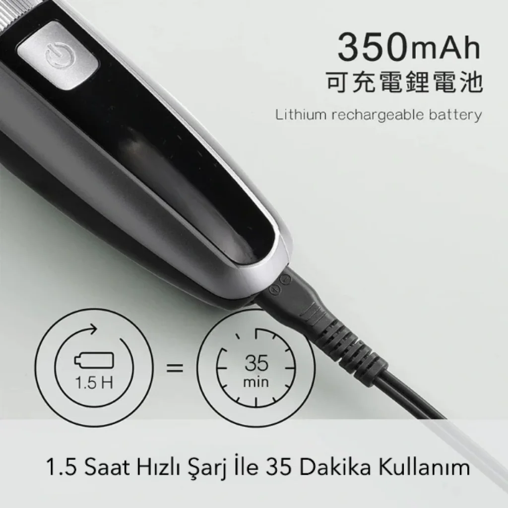 ŞARJLI AYARLANABİLİR SAÇ VE SAKAL TIRAŞ MAKİNESİÜrün ÖzellikleriSaç ve sakal tıraş makinesi, güçlü 3.7V yüksek performanslı motoru sayesinde sert ve yoğun saç tellerinde bile pürüzsüz kesim sağlar. Profesyonel kesim bıçakları, geniş uç yapısı ile daha fazla saç telini tek seferde yakalayarak zamandan tasarruf etmenizi sağlar.Makine, ıslak ve kuru kullanım için uygundur ve IPX6 su geçirmezlik seviyesiyle tamamen yıkanabilir, kolayca temizlenir. 2 farklı tarakla (1–10 mm / 11–20 mm aralığında, 38 seviye ayarlanabilir uzunluk) her saç ve sakal stiline uygun hassas kesim yapılabilir.Dokunmatik açma-kapama tuşu ve hızlı ayar düğmesi, pratik kullanım sunar. LED göstergesi şarj, düşük pil ve tam dolum durumlarını net bir şekilde gösterir.Güçlü 350mAh lityum batarya sayesinde 1,5 saatte tam şarj olur ve 4 saate kadar kesintisiz kullanım sağlar. USB girişi ile evde, ofiste veya seyahatte kolayca şarj edilebilir.Paket İçeriği1 adet Hyundai PHT-048 tıraş makinesi2 adet ayarlanabilir tarak başlığı1 adet USB şarj kablosu1 adet bakım fırçası