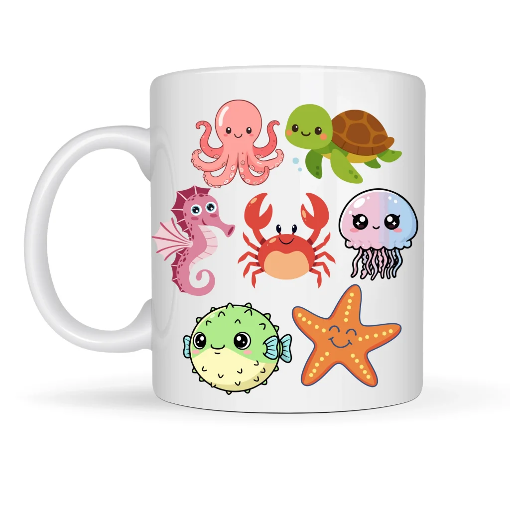 Bu özel tasarım porselen kupa üzerinde; ahtapot, deniz kaplumbağası, yengeç, denizatı, denizanası ve deniz yıldızı gibi birbirinden sevimli deniz canlıları yer alıyor.