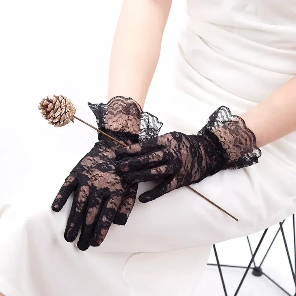 Zarafetin en şık tamamlayıcısı olan siyah dantel kısa eldiven, özel günlerde ve kombinlerde fark yaratmak isteyenler için tasarlandı. İnce ve transparan dantel yapısı, çiçek desen detayları ve bilek kısmındaki fırfırlı tül tasarımı ile feminen ve dikkat çekici bir görünüm sunar.