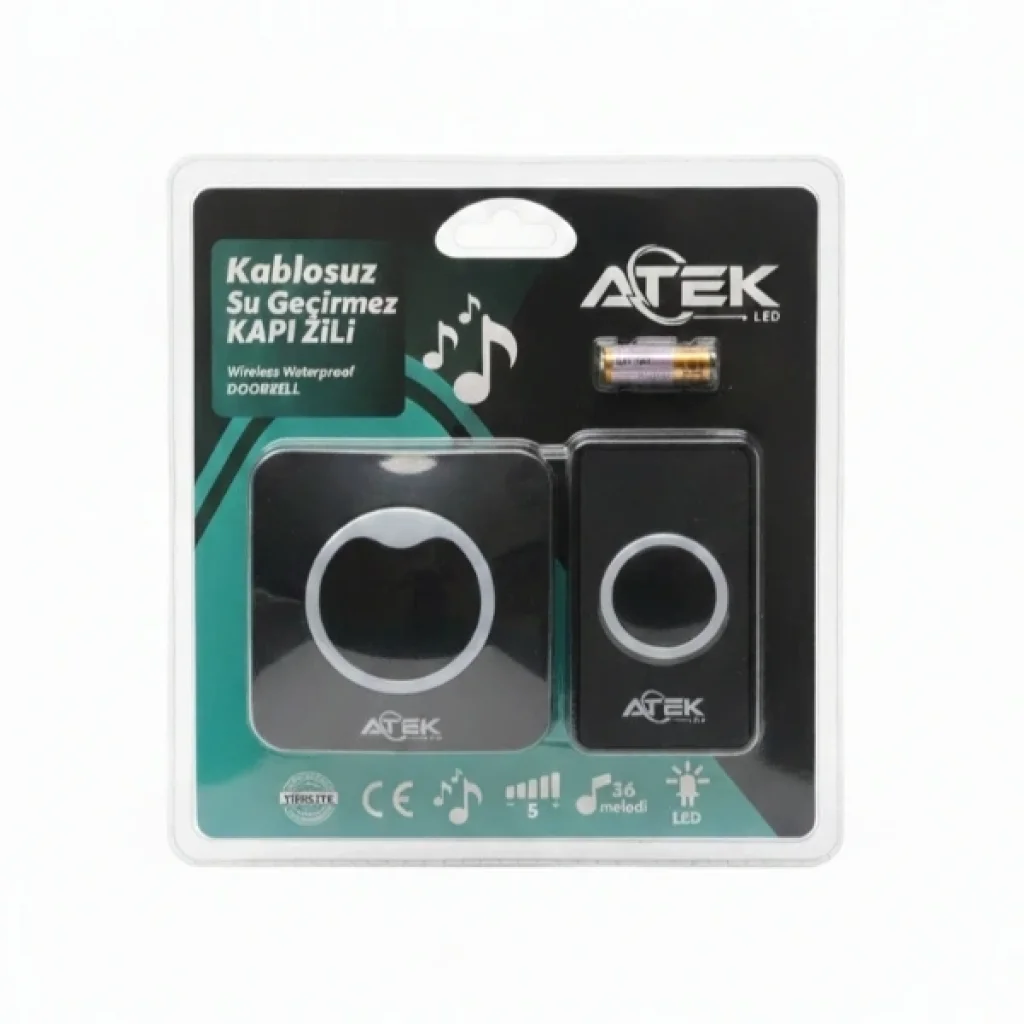 SİYAH KABLOSUZ SU GEÇİRMEZ KAPI ZİLİÜrün ÖzellikleriSiyah Kablosuz Su Geçirmez Kapı Zili, modern tasarımı ve yüksek performansı ile hem iç hem de dış mekânlarda kusursuz kullanım sağlar. Su geçirmez yapısı sayesinde dış kapılarda güvenle kullanılabilirken, LED ışıklı uyarı özelliği ile zil çaldığında görsel bildirim sunarak sesin duyulmadığı durumlarda bile fark edilir hale gelir. 36 farklı ayarlanabilir melodi seçeneği kullanıcıya özgür bir seçim imkânı sunar ve her ortama uyum sağlayacak bir kullanım deneyimi oluşturur. Kablo gerektirmeyen pratik montajı sayesinde kapı girişlerine, ofislere veya iş yerlerine saniyeler içinde kolayca uygulanabilir. Sessiz ve dayanıklı çalışma yapısı ile uzun süreli verimlilik sunan bu kablosuz zil, şık siyah rengiyle kapınıza modern bir görünüm kazandırır.Paket İçeriği1 adet Siyah Kablosuz Su Geçirmez Kapı Zili