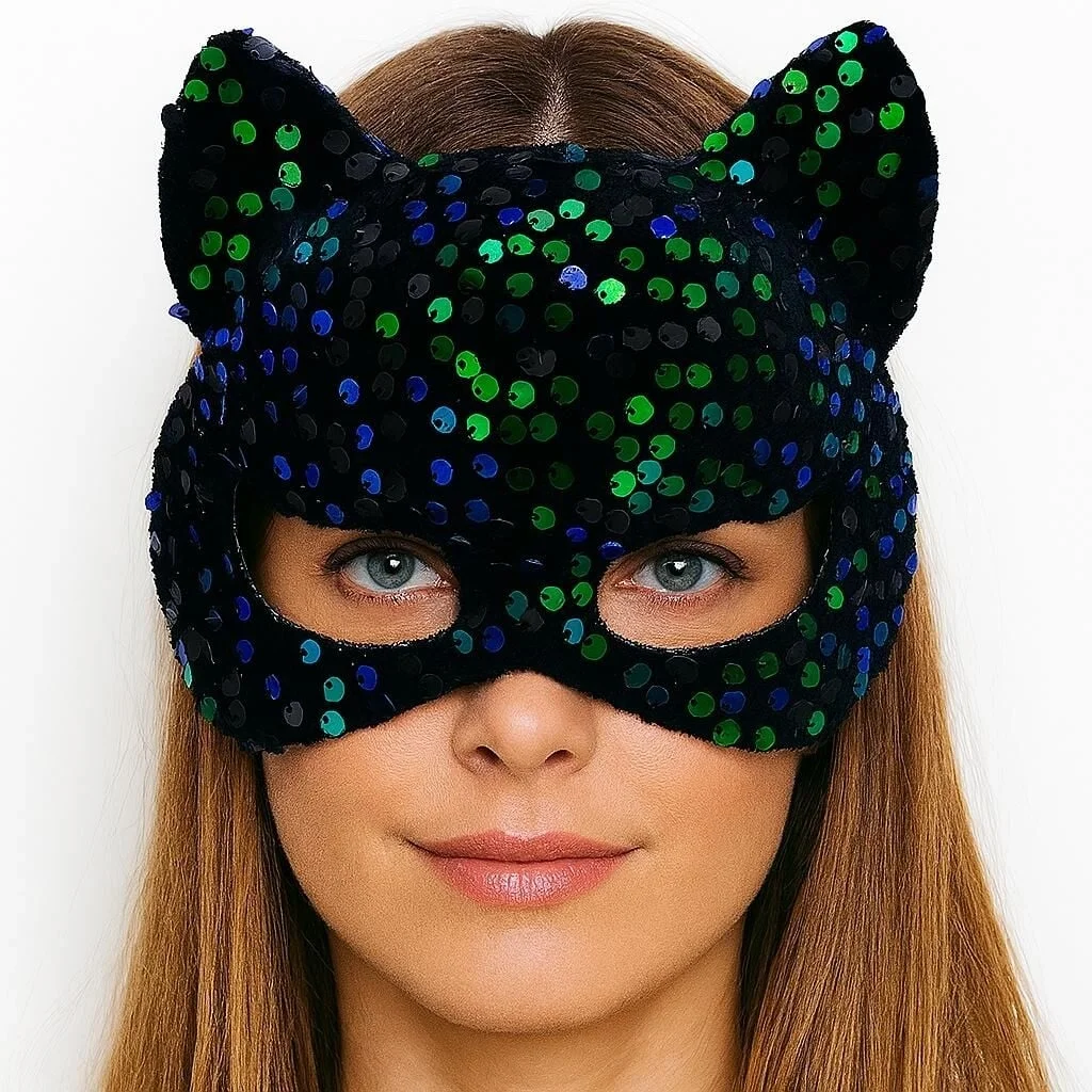 BUĞZ Siyah Kadife Kumaş Üzerine Mavi Yeşil Payetli Pullu Parti Maskesi 16x14 cm