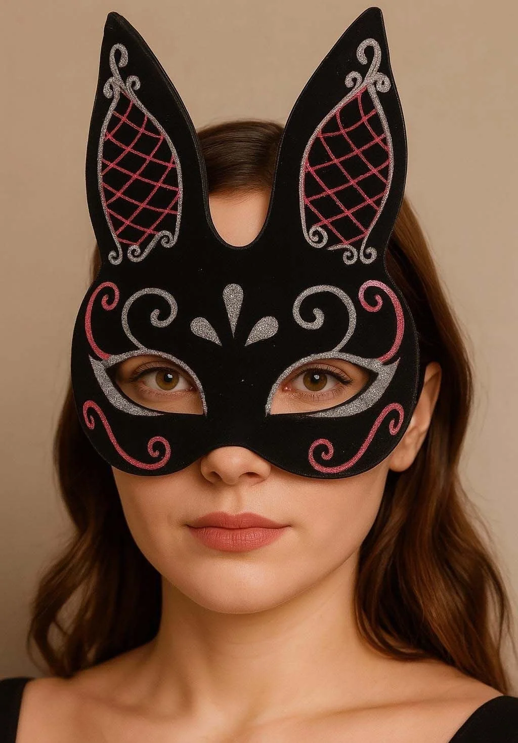 BUĞZ Siyah Renk Kırmızı Beyaz Simli Siyah Süet Kaplama Tavşan Maskesi 18x16 cm