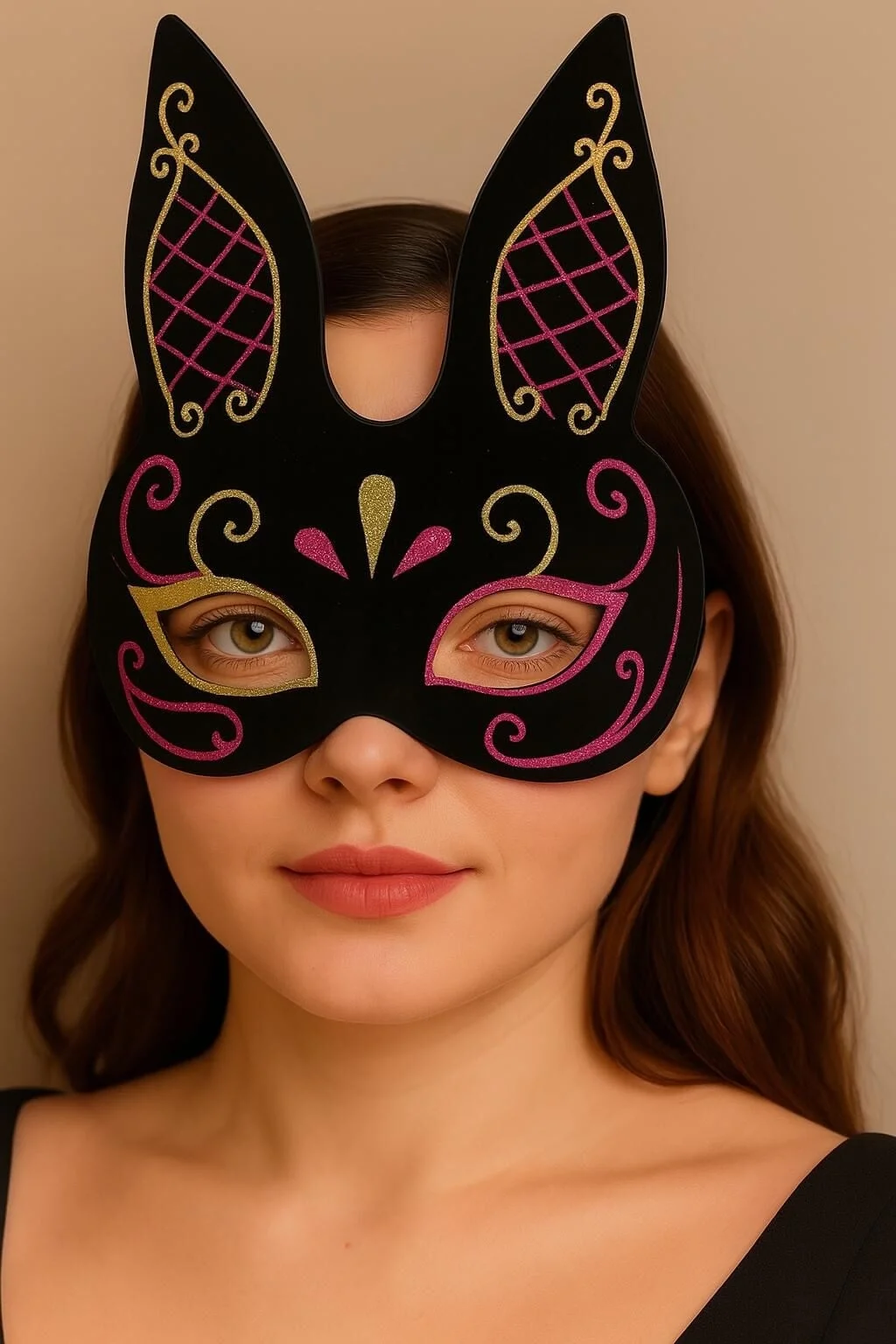 BUĞZ Siyah Renk Kırmızı Gold Simli Siyah Süet Kaplama Tavşan Maskesi 18x16 cm