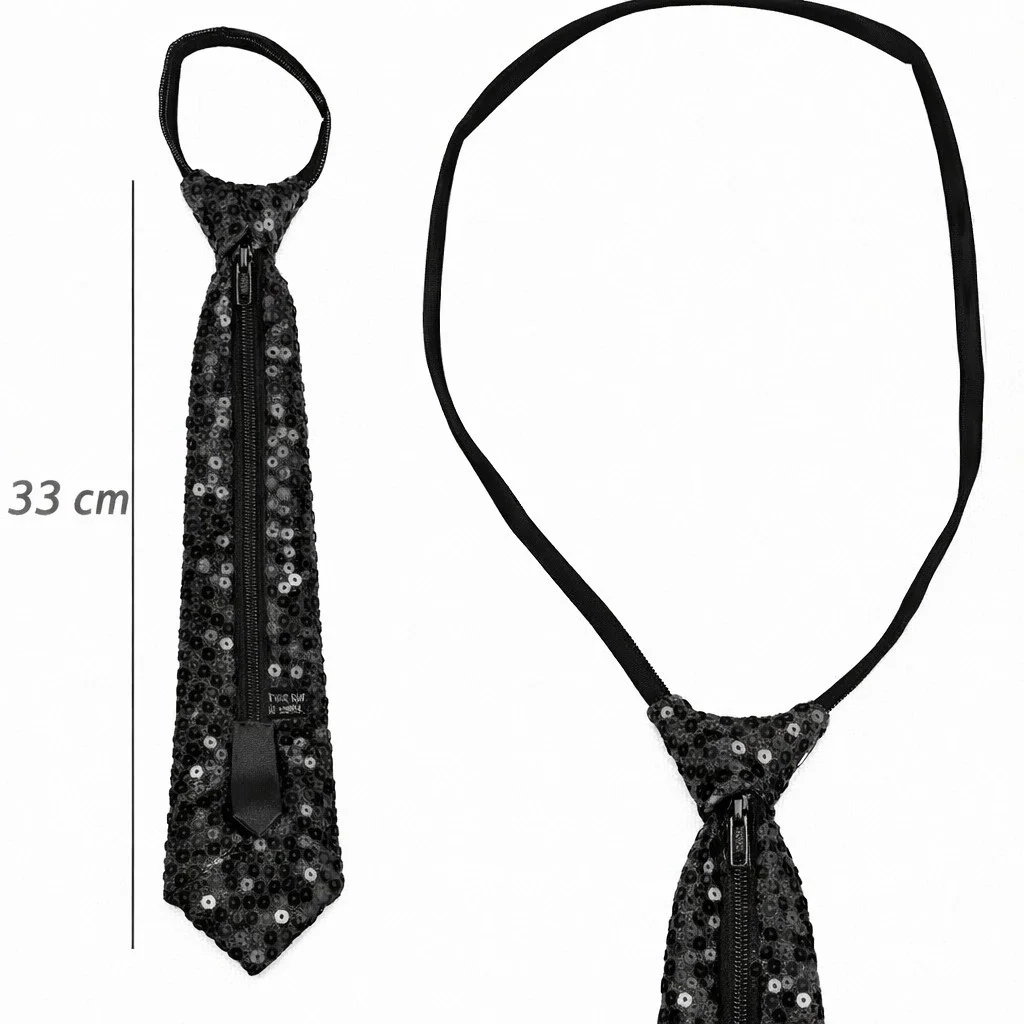 Siyah payetli fermuarlı parti kravatı sahne performansları, doğum günü organizasyonları, yılbaşı partileri, konsept etkinlikler ve eğlence geceleri için tasarlanmıştır. Parlak payet yüzeyi ışık altında dikkat çekici bir ışıltı sağlar ve klasik siyahın asil duruşunu modern bir dokunuşla birleştirir.