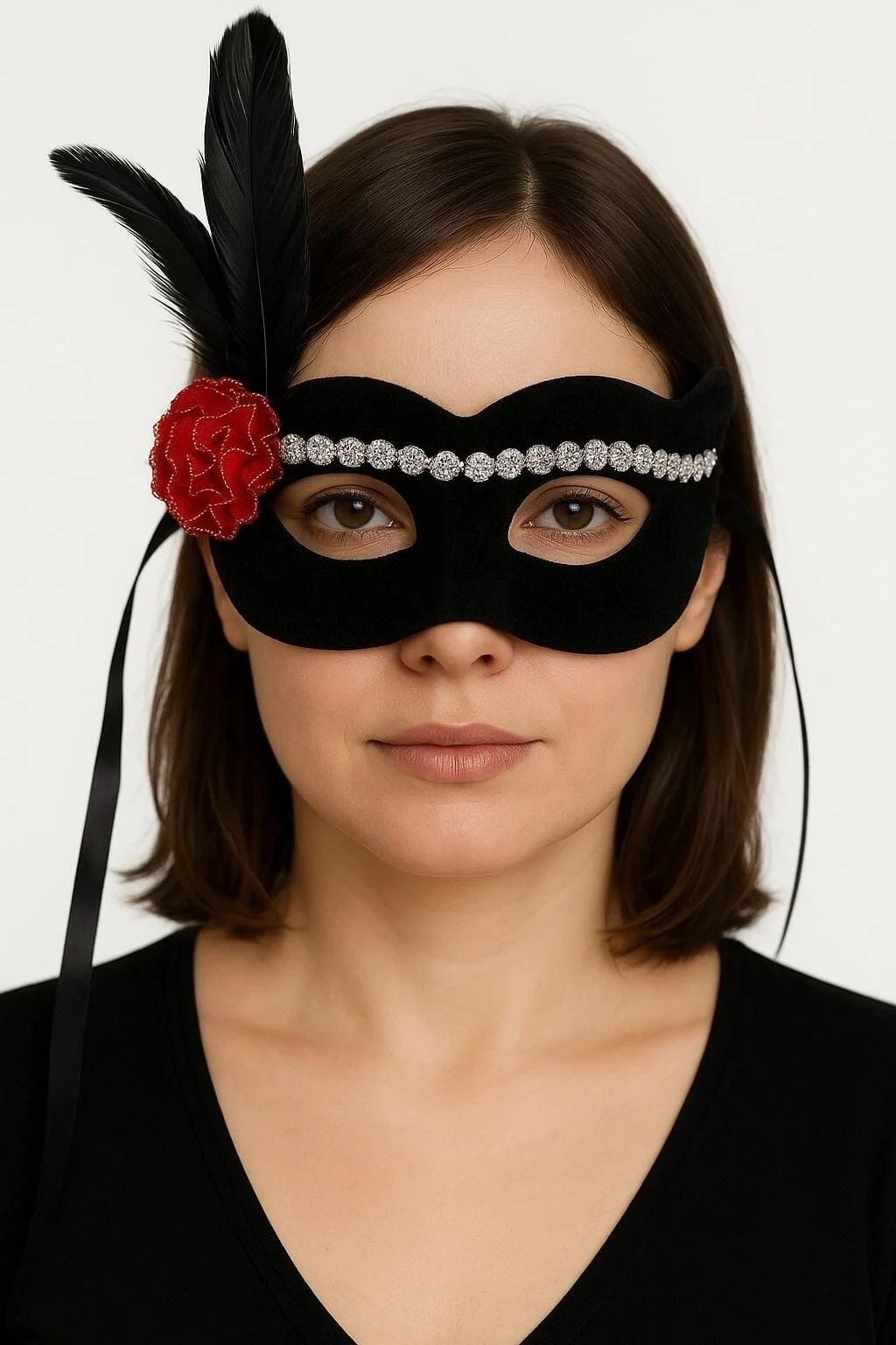 BUĞZ Siyah Renk Süet Kaplama Gümüş Dantelli Kırmızı Gül Tasarımlı Parti Maskesi 18x20 cm