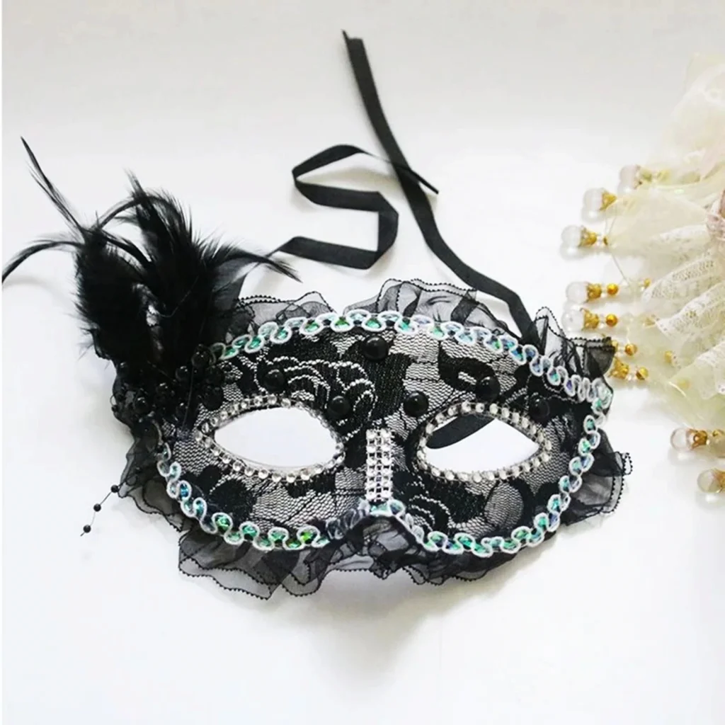 Siyah Renk Yandan Tüylü İnci İşlemeli Taşlı Dantelli Parti Maskesi, balolar, maskeli partiler veya özel geceler gibi özel günlerde zarif ve göz alıcı bir görünüm elde etmek isteyenler için mükemmel bir seçimdir. Siyah dantel kaplaması, zarif incileri ve yandan sarkan tüyleri ile bu maske sizi partinin en şık ve zarif konuğu yapacak.