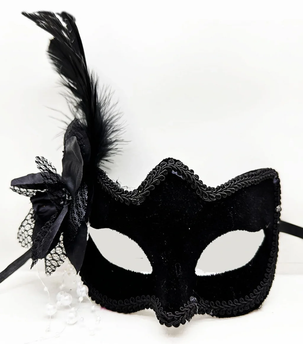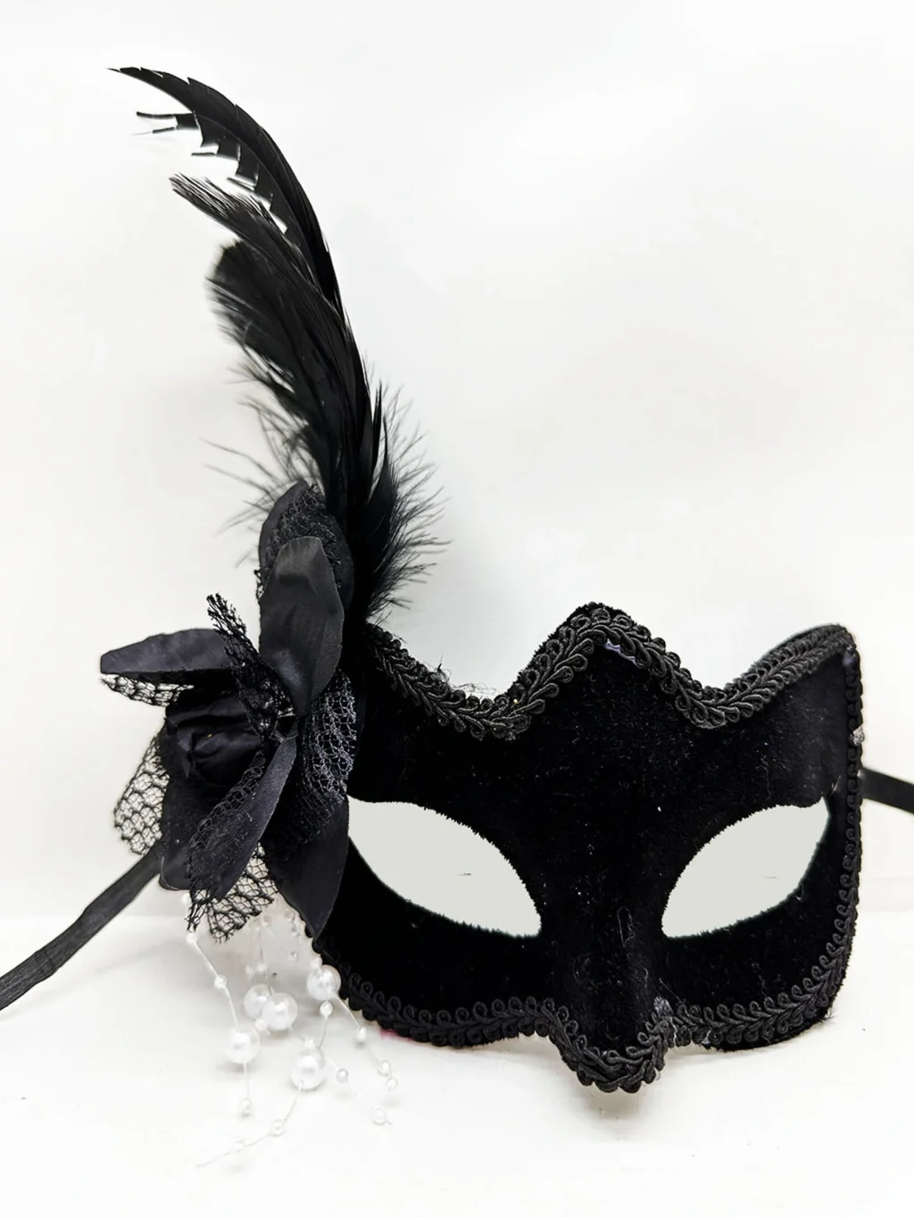 BUĞZ Siyah Süet Yandan Tüylü İncili Parti Maskesi