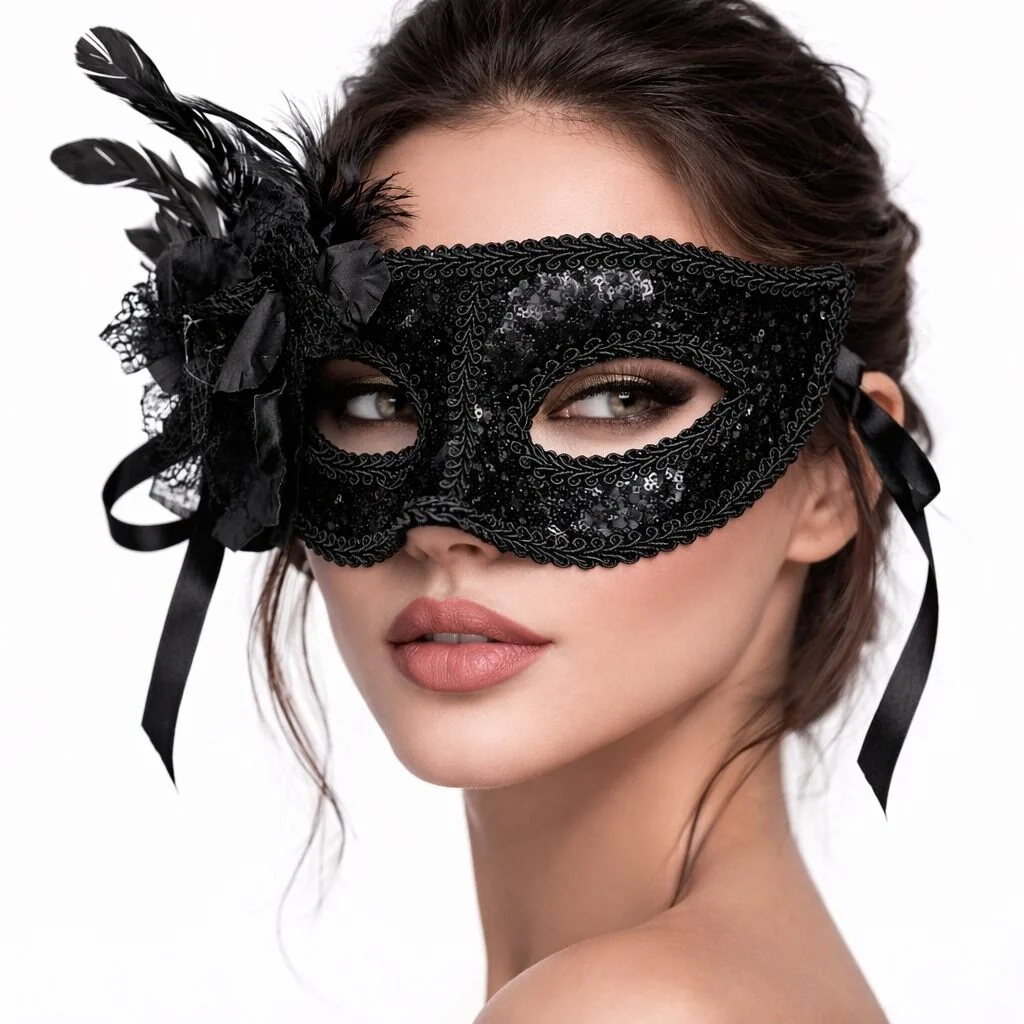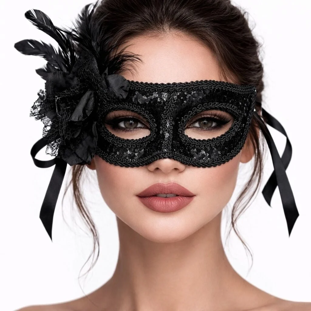 BUĞZ Siyah Venedik Parti Maskesi – Çiçekli Tüylü Payetli