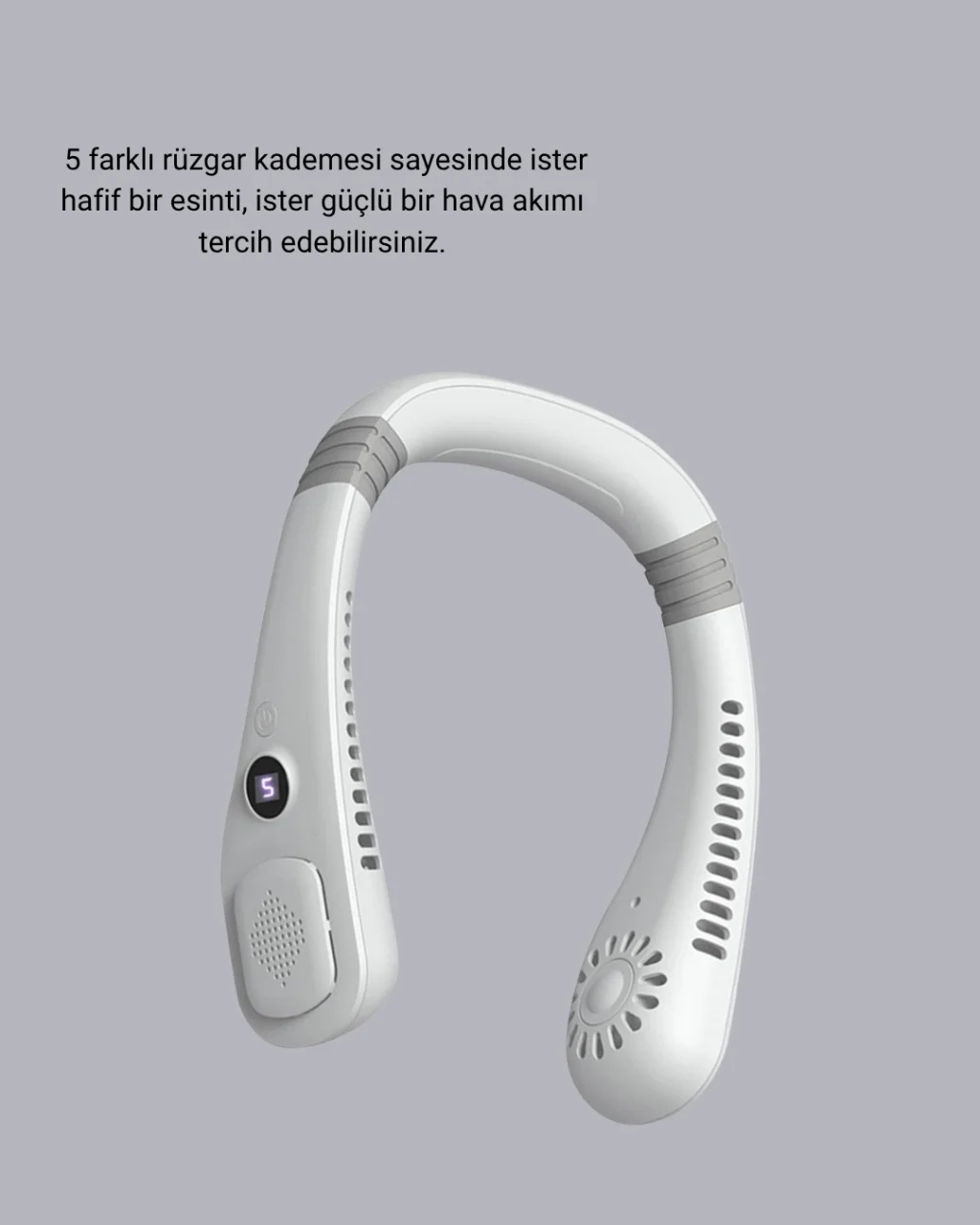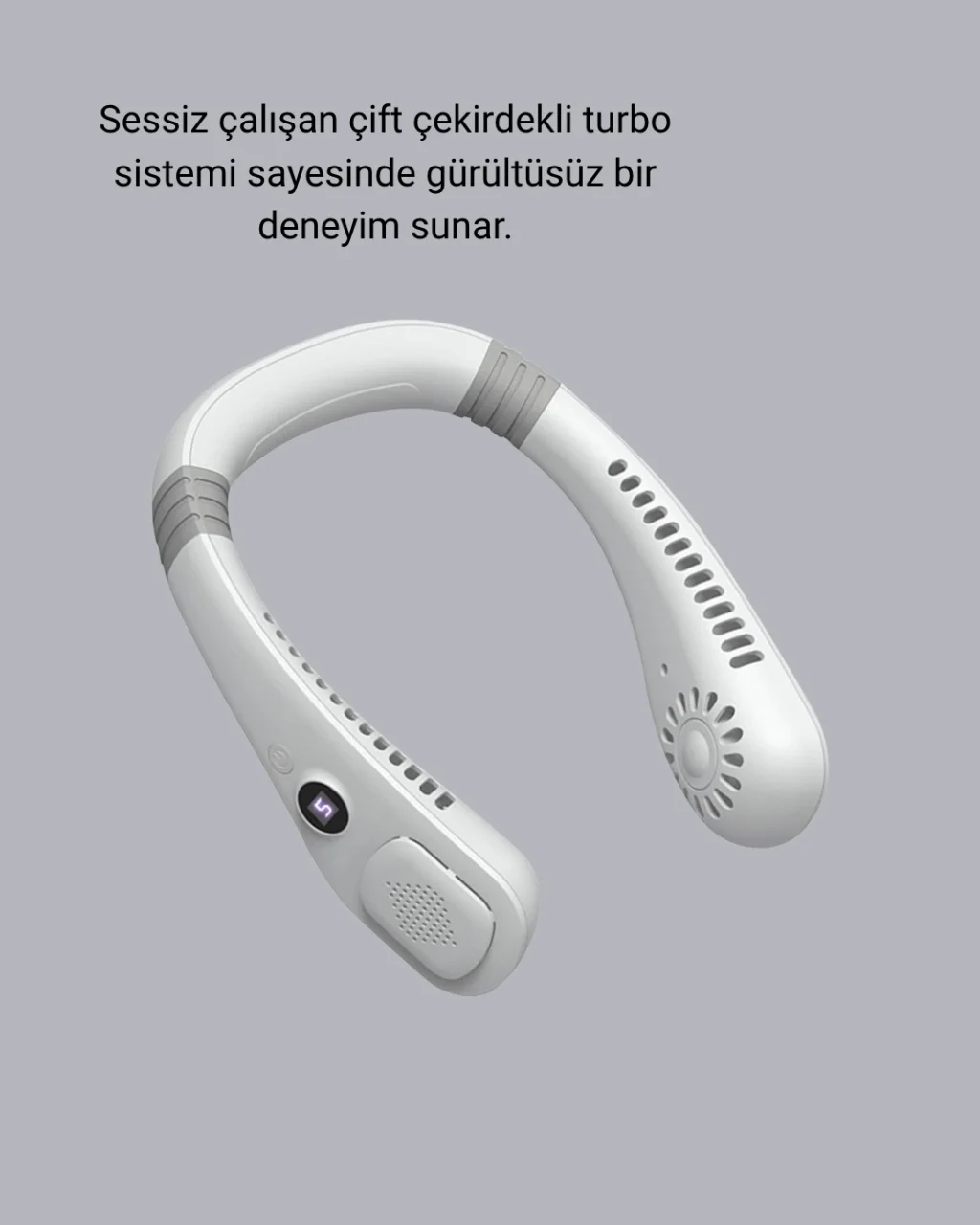 Taşınabilir Boyun Fanı Sessiz Çalışma ve USB Şarj Özellikli, sıcak yaz günlerinde kişisel serinleme deneyimini yeniden tanımlıyor.Çift motorlu turbo fan sistemi, güçlü hava akımı yaratırken minimum gürültüyle çalışır.360° dairesel hava çıkışı sayesinde tüm boyun bölgesine eşit serinlik sağlar.Kanatsız tasarımı, saç dolanmasını önler ve güvenli kullanım sunar.5 farklı hız kademesiyle istediğiniz seviyede serinliği ayarlayabilir, ofiste, seyahatte veya açık havada özgürce kullanabilirsiniz.Ergonomik tasarımı, uzun süreli kullanımlarda boyun yorgunluğu oluşturmaz.USB bağlantısı ile kolayca şarj edilir ve tek şarjla saatlerce kesintisiz çalışır.Hafif ve taşınabilir yapısı sayesinde çantanızda kolayca taşıyabilir, dilediğiniz her yerde anında ferahlık hissi yaşayabilirsiniz.Yazın enerjik ve ferah geçmesi için ideal bir seçim!