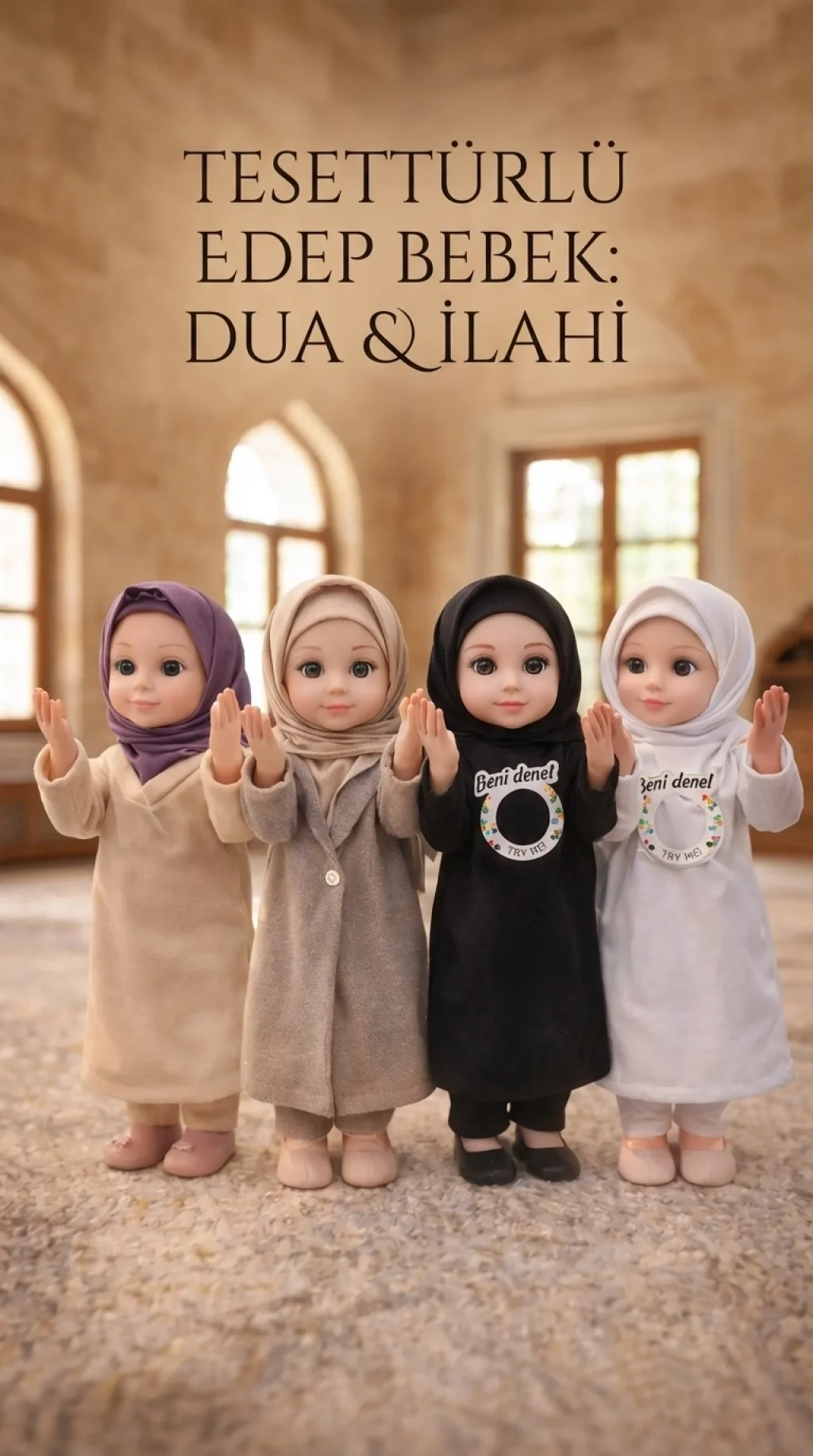 Tesettürlü bebek, ilahiler söyleyip dua ederek çocuklara manevi değerleri öğretir. Ramazan ve özel günlerde keyifle kullanılabilir. Yumuşak malzemesi ve sevimli tasarımıyla çocukların dikkatini çeker.