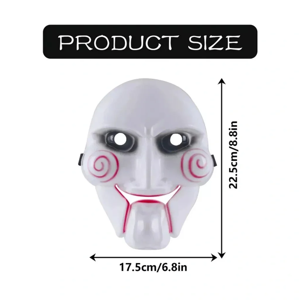 TESTERE SAW MASKESİ – 17.5 x 22.5 CMÜrün ÖzellikleriTestere Saw maskesi, korku ve gerilim temalı kostüm partileri, cadılar bayramı etkinlikleri ve özel konsept kutlamalar için tasarlanmıştır. Dayanıklı plastik malzemeden üretilmiş olup uzun süreli kullanım için uygundur. Yüz hatlarına tam oturan yapısı sayesinde rahat kullanım sağlar. Göz, burun ve ağız bölgesinde bulunan doğal kesimlerle nefes almayı ve görmeyi kolaylaştırır. Ayarlanabilir lastikli kayışı sayesinde farklı yüz ölçülerine uyum sağlar. 17.5 x 22.5 cm boyutlarıyla yetişkinler için ideal ölçüdedir.Paket İçeriği1 adet Testere Saw maskesi