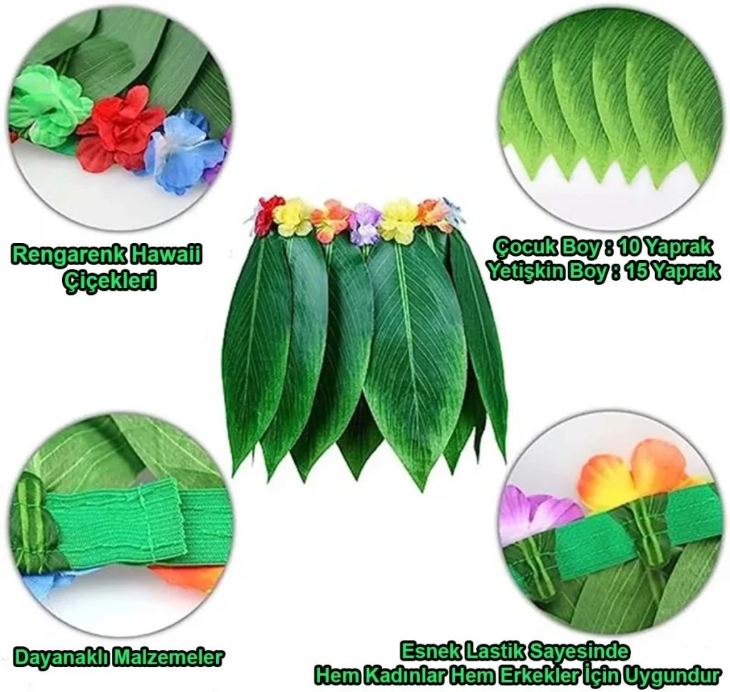 BUĞZ Yetişkin ve Çocuk Uyumlu Luau Aloha Hawaii Kolye Renkli Etek Taç ve Bileklik Seti
