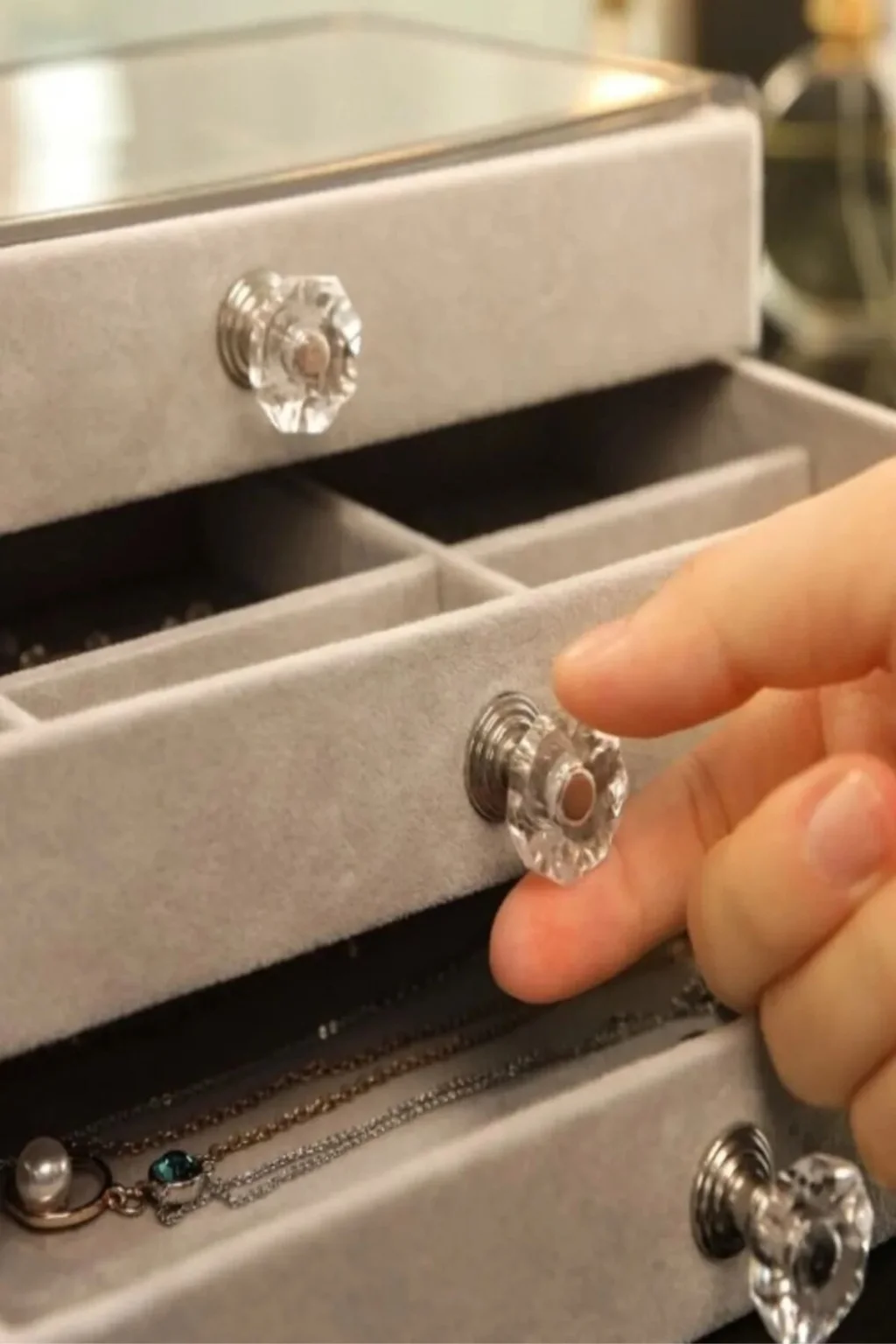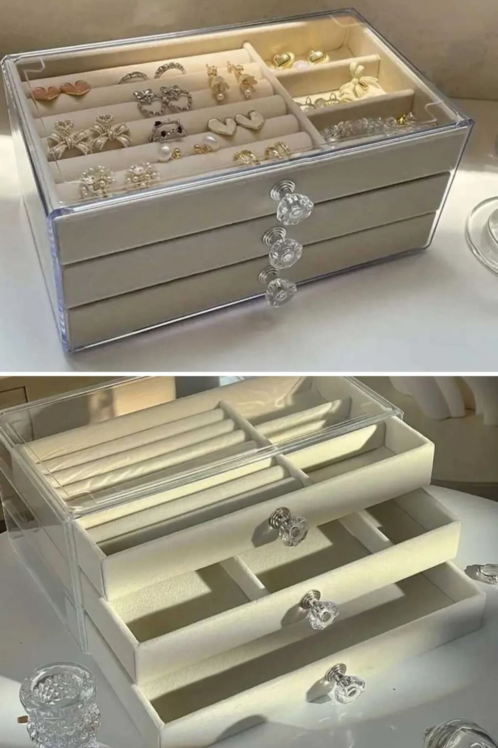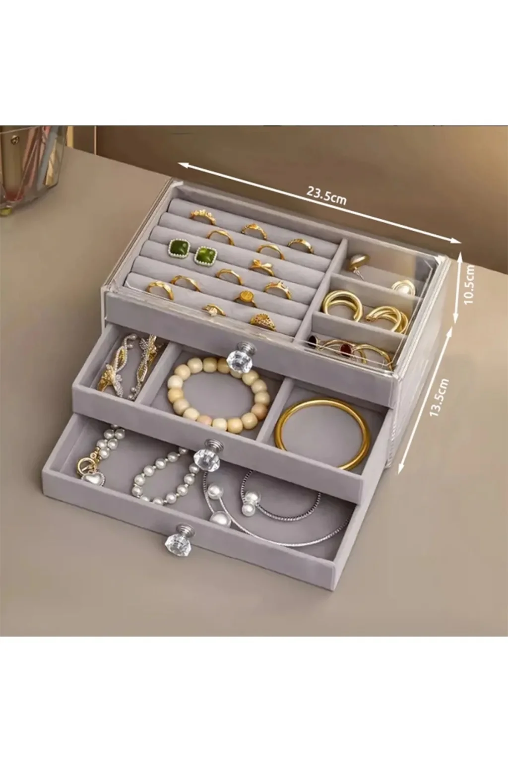 Bu üç katlı çekmeceli takı kozmetik organizer ile eşyalarınızı düzenli tutabilir, kolayca erişebilir ve saklayabilirsiniz.
