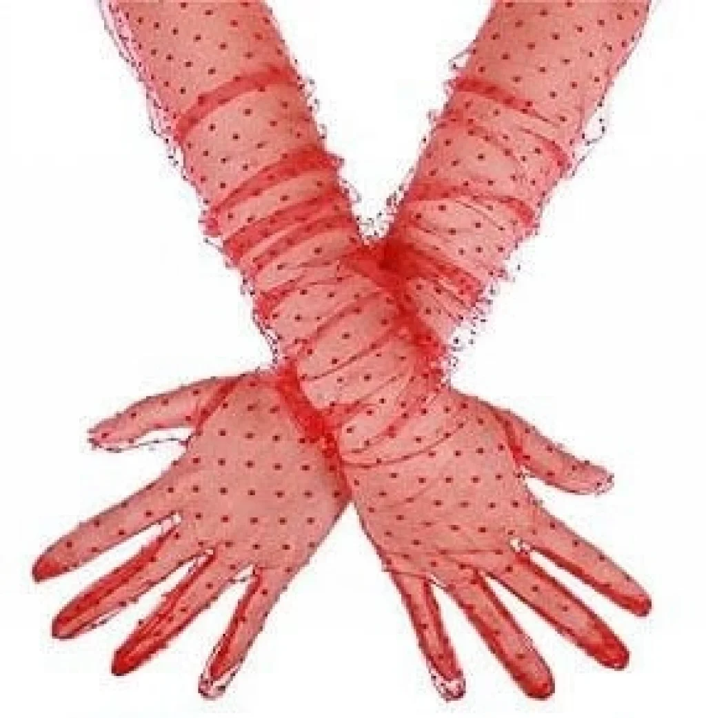 BUĞZ Uzun Boy Kırmızı Puantiyeli Kırmızı Renk Yetişkin Tül Eldiven 55 cm