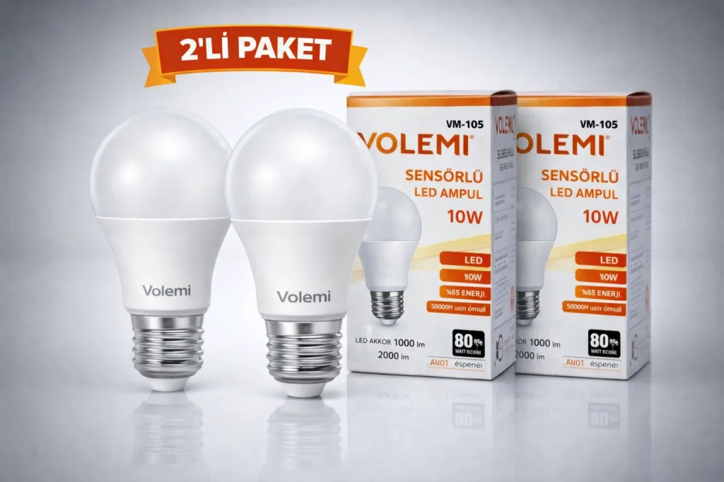 Volemi VM-10S Sensörlü LED Ampul 10W 2000 Lümen E27 Duy 50000 Saat Ömür Enerji Tasarruflu Beyaz Işık 2 Adet