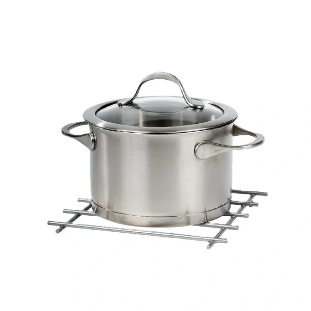 YANMAZ PASLANMAZ ÇELİK NİHALE KROM RENK Ürün ÖzellikleriModern tasarımıyla dikkat çeken bu yanmaz paslanmaz çelik nihale, yüksek ısıya dayanıklı yapısı sayesinde sıcak tencerelerinizi, tavalarınızı ve çaydanlıklarınızı güvenle tezgâh üzerine koymanıza olanak tanır. Krom renkli dış yüzeyi mutfak dekorasyonuna şıklık katarken, paslanmaz çelik malzemesi sayesinde uzun ömürlü kullanım sağlar. 20x20 cm boyutundaki kare formu, hem büyük hem küçük kaplar için ideal bir kullanım alanı sunar. Alt kısmındaki silikon kaydırmaz ayaklar sayesinde yüzeye zarar vermez ve kaymayı önler. Hem işlevsel hem de estetik açıdan mutfakta vazgeçilmez bir yardımcıdır.Paket İçeriği1 Adet Yanmaz Paslanmaz Çelik Nihale
