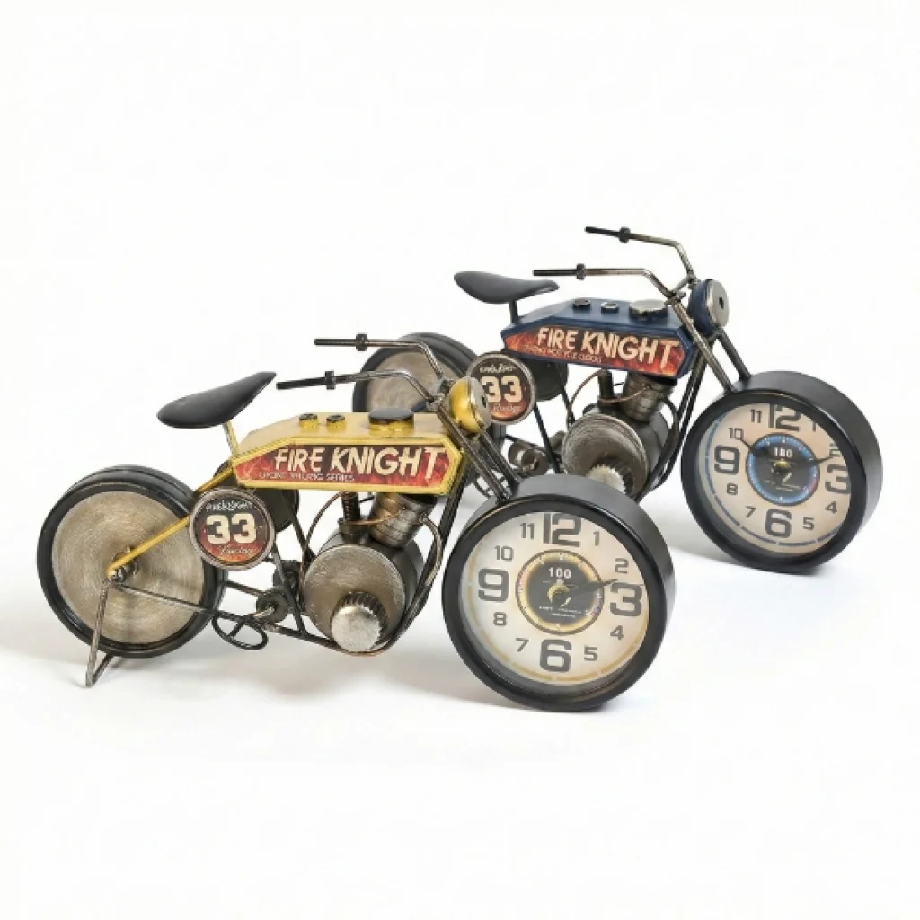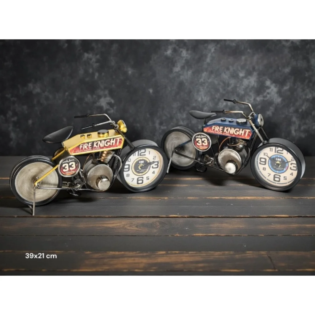YARIŞ MOTORU TASARIMLI MASAÜSTÜ SAATÜrün ÖzellikleriYarış motoru tasarımlı masaüstü saat, hız ve yarış ruhunu dekoratif bir obje formunda yaşam alanlarına taşıyan özgün bir tasarıma sahiptir. Klasik yarış motosikletlerinden ilham alınarak hazırlanan gövde yapısı, metal görünümlü motor bloğu, geniş jant detayları, egzoz ve sele tasarımıyla gerçekçi ve koleksiyonluk bir görünüm sunar. Ön tekerlek kısmına entegre edilmiş analog saat mekanizması, büyük ve net rakamları sayesinde kolay okunabilirlik sağlarken dekoratif bütünlüğü bozmadan işlevsellik kazandırır. 39x21 cm ölçüsü ile masa, raf, kitaplık, konsol veya vitrin üzerinde rahatlıkla sergilenebilir ve bulunduğu ortamda dikkat çekici bir odak noktası oluşturur. Sessiz çalışan mekanizması sayesinde ofis, çalışma alanı veya ev ortamlarında rahatsız edici bir ses oluşturmaz. Retro, endüstriyel ve motor temalı dekorasyon stilleriyle uyumlu yapısı sayesinde özellikle motor tutkunları ve koleksiyon meraklıları için ideal bir dekoratif üründür. Renk seçimi yapılamamakta olup ürün, görsellerde yer alan yarış motoru modellerinden biri olacak şekilde karışık olarak gönderilmektedir. Estetik duruşu, detaylı işçiliği ve tematik tasarımıyla hem dekoratif kullanım hem de hediye alternatifi olarak öne çıkar.Paket İçeriği1 adet yarış motoru tasarımlı masaüstü saat