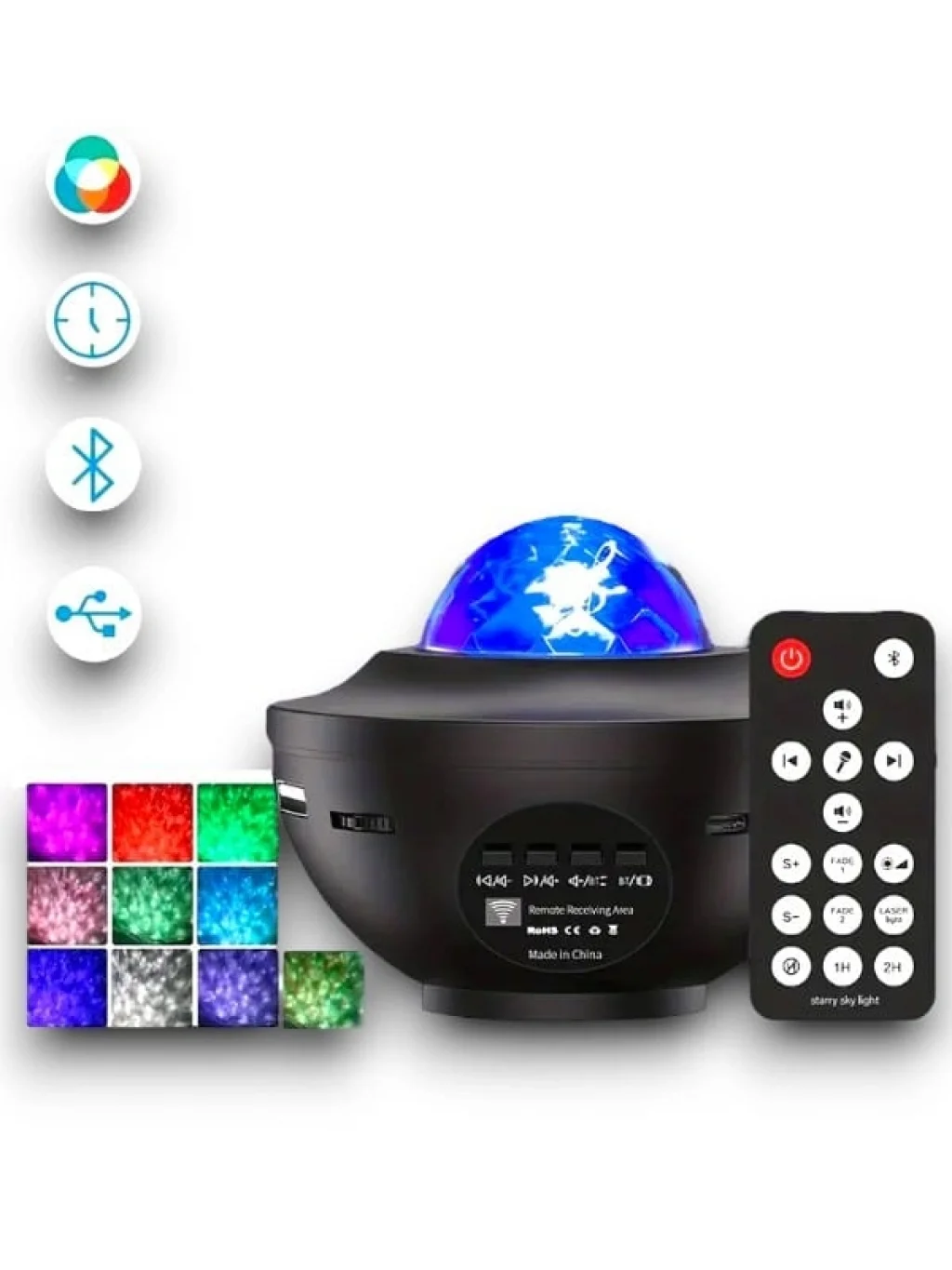 * 10 renk dinamik projeksiyonlar: beş standart renk, kırmızı su dalgası, mavisu dalgası, yeşil su dalgası, beyaz su dalgası ve yeşil lazer noktası, her ikirenk karıştırılabilir ve her iki su dalgası rengi de yeşil lazer noktası ilekarıştırılabilir, Böylece en fazla 10 renk alabilirsiniz. Size muhteşem biryıldızlı ışık göstermek için, farklı hızların dinamik gece projeksiyonu ilekombine çeşitli renkler, rahat, romantik, renkli bir uzay projeksiyon ortamıyaratmak.* Uzaktan kumanda ve müzikal: uzaktan kumanda ile (2XAAA pil kullanın-dahildeğildir), gece ışığını açmak veya kapatmak için yataktan veya kanepedençıkmaktan endişelenmenize gerek yok, uzaktan da yıldız projektör ışık kontroledebilirsiniz, renkli ışıklar, parlaklığı ayarlamak, serbestçe açmak/kapatmaklamba, aydınlatma modunu değiştirmek, Müzik şarkıları, zamanlayıcı. En son sesetkinleştirilmiş titreme modu, projeksiyonun rengi müzik ritmine göredeğiştirmesini veya ellerinizi çırpmasını sağlar ve bu da yıldızlı birprojeksiyon ile sonuçlanır.* Bluetooth hoparlörler ve zamanlayıcılar: favori müziğinizi Bluetooth veya USBüzerinden seçebilirsiniz. Yüksek kaliteli müzik ve yıldızlı projeksiyonlar geceromantik ve yatıştırıcı bir ortam yaratır. Zamanlayıcı seçeneği daha enerjiverimli, ayrıca tüm gece ışığını da atabilirsiniz.* Otomatik kontrol zamanlayıcısı: dinamik bulutsu'nun yıldız projektör ışıkdahili 1H, 2H, otomatik kapanma zamanlayıcısı, gece ışık projektör projektörışık önceden ayarlanmış süreden sonra otomatik olarak kapanacaktır. Ve tabiiki, zamanlayıcı tüm gece boyunca kalmak için iptal edilebilir.* Aile ve çocuklar için hediyeler: yıldız projektör gece lambası doğum günüiçin uygundur, parti, düğün, oda dekor, çocuk günü, noel, yıldönümü hediyeler,harika ve yıldızlı bir atmosfer yaratır, çocukların meraklarını, hayal gücünü,yaratıcılıklarını teşvik etmelerine yardımcı olur. Ayrıca bir okyanus dalgasıprojektör, romantik ruh ışık, gece lambası ve başucu lambası olarak içdekorasyon için mükemmelleştirir.* Müzik yıldızlı gece ışık projektör: yıldızlı gece lambası, bebekler için iyibir uyku ortamı yaratarak, aileniz veya arkadaşlarınız için unutulmaz bir gecegösteren, duvarlara ve tavana gerçekçi bir yıldızlı gece yansıtabilir.Ürün Markası: BUĞZ