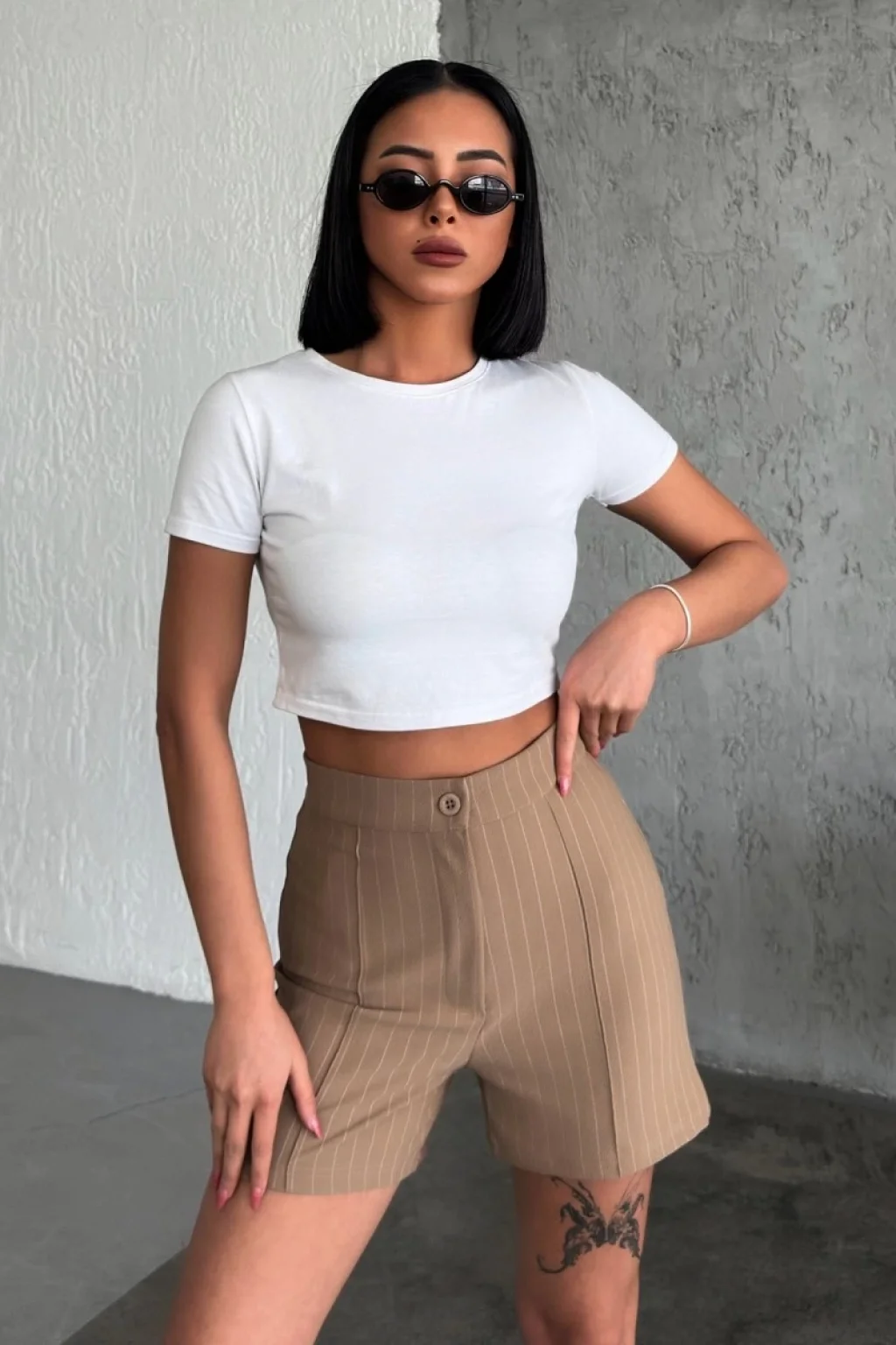 Zarif ve Şıklığı Bir Arada Sunan Yüksek Bel Krep Esnek Çimalı Çizgili Şort Bej -Yüksek bel tasarımıyla vücudu saran ve zarif bir görünüm sunan, krep çımalı çizgili şort bej rengiyle gardırobunuzu güncelleyin. Bu şort, esnek likralı kumaşıyla hareket özgürlüğü ve konfor sunarken, şık çımalı çizgileriyle de tarzınızı tamamlayacak.