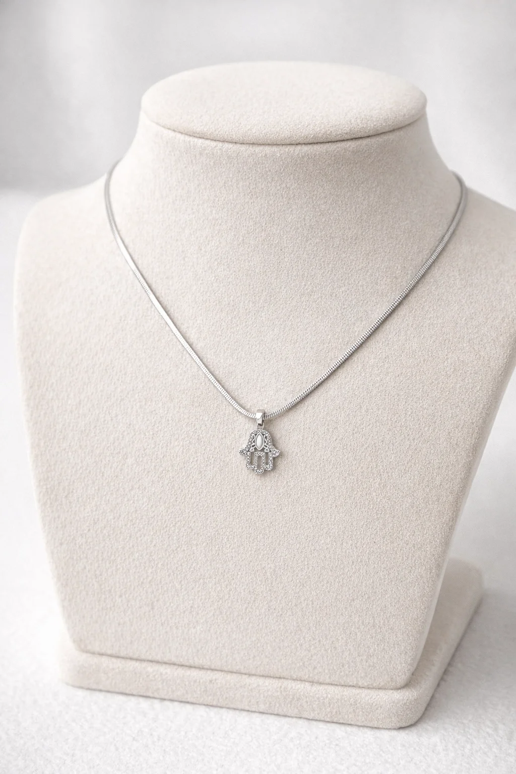 Zirkon Taşlı Hamsa Fatma Eli Çelik Kolye MODEL 1 – Kararmaz, Alerji Yapmaz Zarif Kadın Kolyesi Şıklığı ve anlamı bir arada sunan Hamsa (Fatma Eli) figürlü çelik kolye, günlük kullanımdan özel davetlere kadar her kombine zarif bir dokunuş katar. Minimal boyutu sayesinde boyunda abartı durmaz, modern ve şık bir görünüm sunar. ?Ürün Özellikleri: