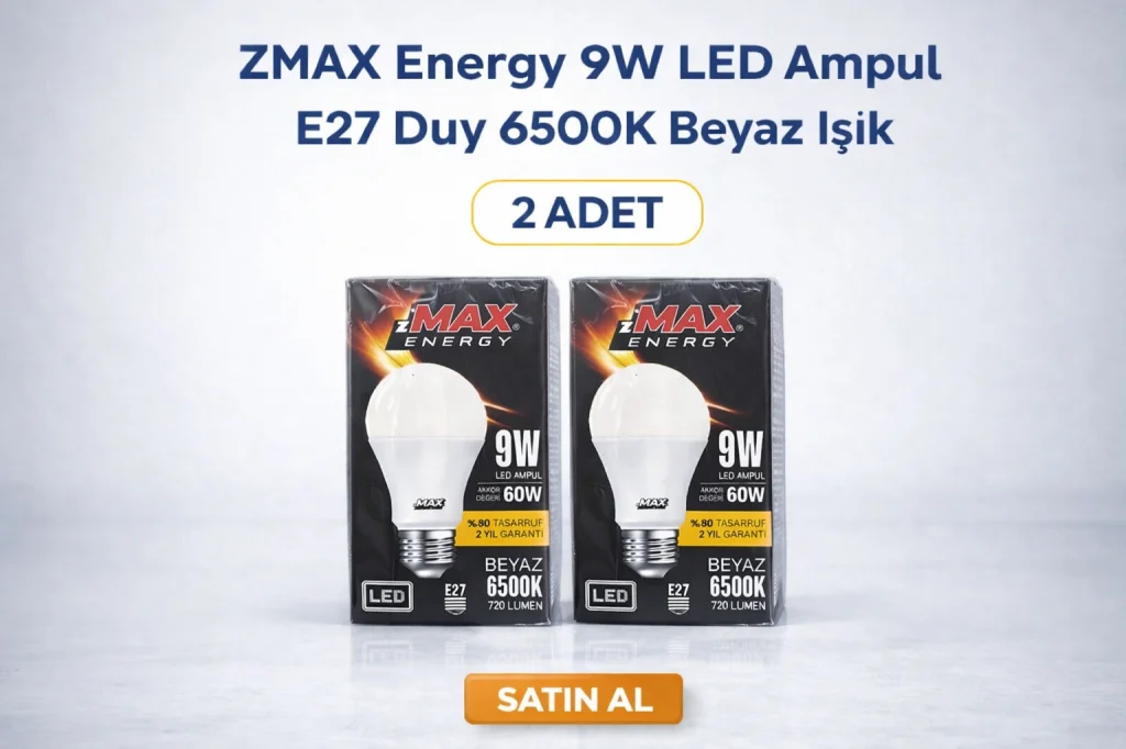 Toplu alımlarda avantajlı fiyat seçeneği ile hem bireysel hem ticari kullanım için uygundur. Teknik Özellikler: Marka: ZMAX Energy Güç: 9W Akkor Eşdeğeri: 60W Işık Rengi: 6500K Beyaz Işık Gücü: 720 Lümen Duy Tipi: E27 Enerji Tasarrufu: %80 Garanti: 2 Yıl Kullanım Alanları: Ev aydınlatması Ofis Mağaza Koridor Mutfak Salon Apartman ortak alanları Uzun ömürlü, ekonomik ve güçlü aydınlatma arayanlar için ideal LED ampul modelidir.