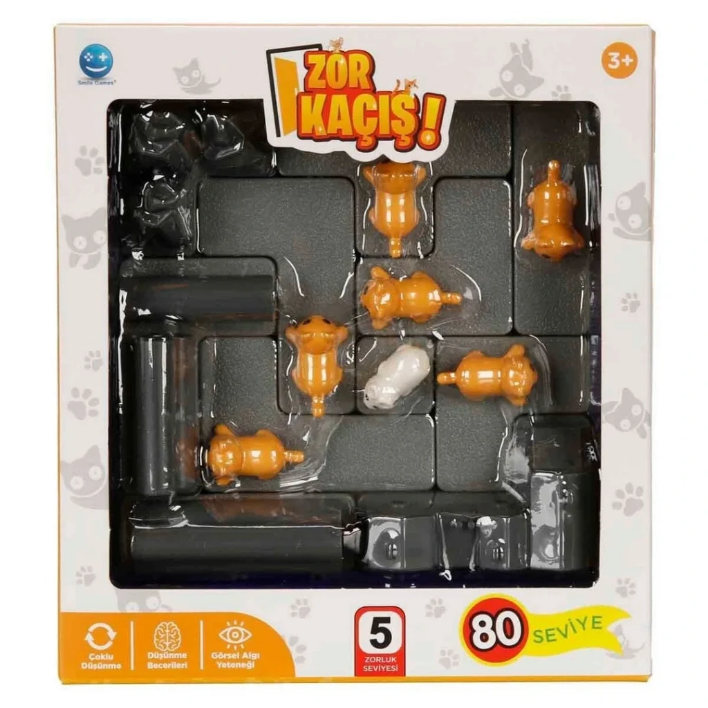 Kediler birlik oluyor, beyaz fare ka.ccedil;amıyor! Beyin fırtınaları ile dolu bu oyunda ka.ccedil;mak .ccedil;ok zor. Ancak neyse ki biz ka.ccedil;an fareyi değil, farenin ka.ccedil;masını engellemeye .ccedil;alışan yavru kediler ile iş birliği yapıyoruz. İlk, orta, ileri, uzman ve usta seviyelerine ayrılmış toplam 80 adet bulmaca var. Kolaydan zora, sırayla t.uuml;m seviyeleri oynayarak Smile Games Zor Ka.ccedil;ış Kutu Oyunu.rsquo;nda beyaz farenin ka.ccedil;masını engellemeye .ccedil;alışırken .ccedil;ok eğleneceksin. Zihin kaslarını .ccedil;alıştırmaya hazır mısın?