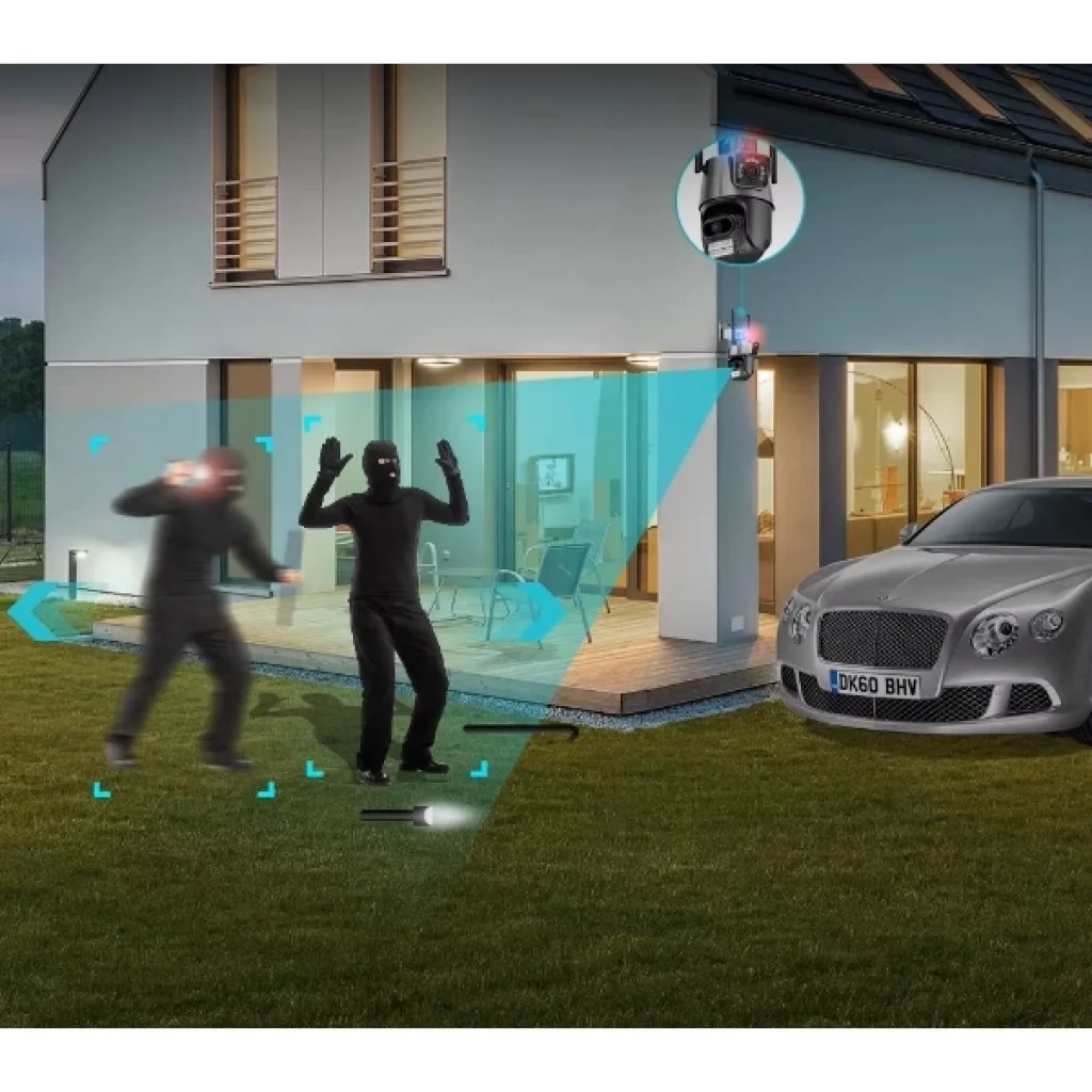 ÇAKARLI ÇİFT LENSLİ DIŞ MEKAN GÜVENLİK KAMERASIÜrün ÖzellikleriÇakarlı çift lensli dış mekan güvenlik kamerası, yüksek çözünürlüklü 8MP görüntü kalitesiyle profesyonel güvenlik çözümleri sunar. Çift lens tasarımı sayesinde geniş açılı ve detaylı görüntü sağlar. Gece görüş özelliği ile düşük ışıkta bile net kayıt yapabilir ve tam renkli gece görüntüleme desteğiyle güvenliği en üst seviyeye taşır. Çakarlı alarm özelliği sayesinde şüpheli durumlarda görsel ve işitsel uyarı verir. Çift yönlü ses desteği sayesinde kamera üzerinden karşılıklı iletişim kurulabilir. IP66 su geçirmezlik standardına sahip olan kamera, yağmur, kar ve toz gibi zorlu hava koşullarında sorunsuz çalışır. Hareket algılama özelliği ile anında mobil cihazlara bildirim gönderir ve Bluetooth desteğiyle hızlı bağlantı imkânı sunar. PTZ kontrol desteği sayesinde 355° yatay ve 90° dikey açıyla çevreyi eksiksiz izleyebilirsiniz.Paket İçeriği1 adet Çakarlı Çift Lensli Dış Mekan Güvenlik Kamerası