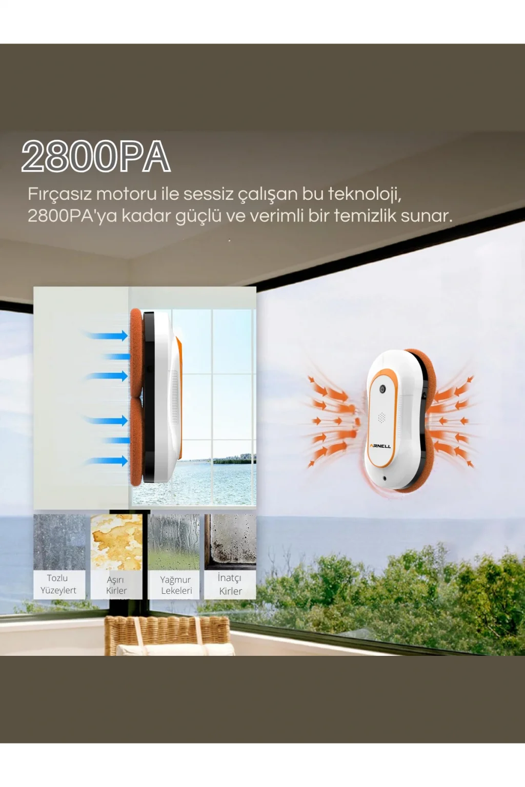 Cambaz Active Cam Silme Robotu: ; Yüksek Performanslı ve Şık Cam Temizliği Cambaz Active, 2800 Pa güçlü emiş gücü ile etkili temizlik sağlayan, akıllı cam temizleme teknolojisiyle tasarlanmış bir robot.; ; Otomatik veya uzaktan kumanda ile manuel olarak kontrol edilebilen bu cihaz, otomatik su püskürtme sistemi ile donatılmıştır.; ; Şık ve modern tasarımıyla hem evde hem de iş yerlerinde kullanım için idealdir.; ; 3 farklı otomatik mod ve manuel mod seçenekleri ile cam temizliğini son derece pratik hale getirir.; ; Akıllı temizleme özelliği sayesinde, temizlik yolunu planlar ve camlarınızı hızlı, verimli ve zahmetsizce temizler.; ; Öne Çıkan Özellikler: ; 2800 Pa Güçlü Emiş: Yüksek emiş gücü sayesinde, Cambaz Active cam yüzeylerine sıkıca yapışır ve en zorlu kirleri bile etkili bir şekilde temizler.; ; Otomatik Su Püskürtme Teknolojisi: 70ml su haznesi ile sürekli nemlendirme sağlayarak inatçı kirleri kolayca temizler.; ; Bir dolum, 25 m²'ye kadar geniş bir alanı etkili bir şekilde temizlemenizi sağlar.; ; Şık ve Kullanışlı Tasarım: ; Cambaz Active, modern ve şık tasarımıyla göz doldururken, kullanım kolaylığıyla da öne çıkar.; ; Ergonomik yapısı, hem evde hem de iş yerlerinde zahmetsiz bir temizlik deneyimi sunar.; ; Güvenli Kullanım: ; Güç kesintilerinde bir sorun yaşanmaması için güvenlik bataryası ile 20 dakikaya kadar camda tutunmaya devam eder.; ; Düşmeyi önleyici güvenlik tasarımı, emniyet halatı ve otomatik durma özellikleriyle tam güvenlik sağlar.; ; Manuel modda uzaktan kumanda ile kontrol edilebilir.; ; Akıllı Yol Planlama: ; Gelişmiş yapay zeka teknolojisi, temizleme yolunu otomatik olarak belirler ve çerçeve algılama sistemi ile tüm pencereyi güvenli ve etkili bir şekilde temizler.; ; İlk Kullanım İçin Öneriler: ; İlk kullanımda yeşil ışık yanana kadar birkaç saat şarj edin.; ; Camın kirlilik durumuna göre temizlik bezini düzenli olarak değiştirin.; ; Temizlik yapmadan önce cam yüzeyindeki büyük kirleri kuru bezle temizleyin.; ; Cihazı güvenlik halatı ile sabitleyip kullanmadan önce camın sağlam olduğundan emin olun.; ; Güneşli havalarda cihazı kuru temizlik modunda kullanarak maksimum performans alın.; ; Arnell Teknoloji ile Güvende Olun! ; 2 yıl garanti süresi ile teknik servis hizmetimiz her zaman yanınızda.; ; Arnell Teknoloji olarak, Cambaz cam silme robotlarınız için her zaman yanınızdayız! Uzman teknik destek ekibimiz, yedek parça temininden rehberliğe kadar ihtiyaçlarınızı karşılamak için hazır.; Cambaz robotlarınızın performansını en üst düzeyde tutmak için bize güvenebilirsiniz! ;