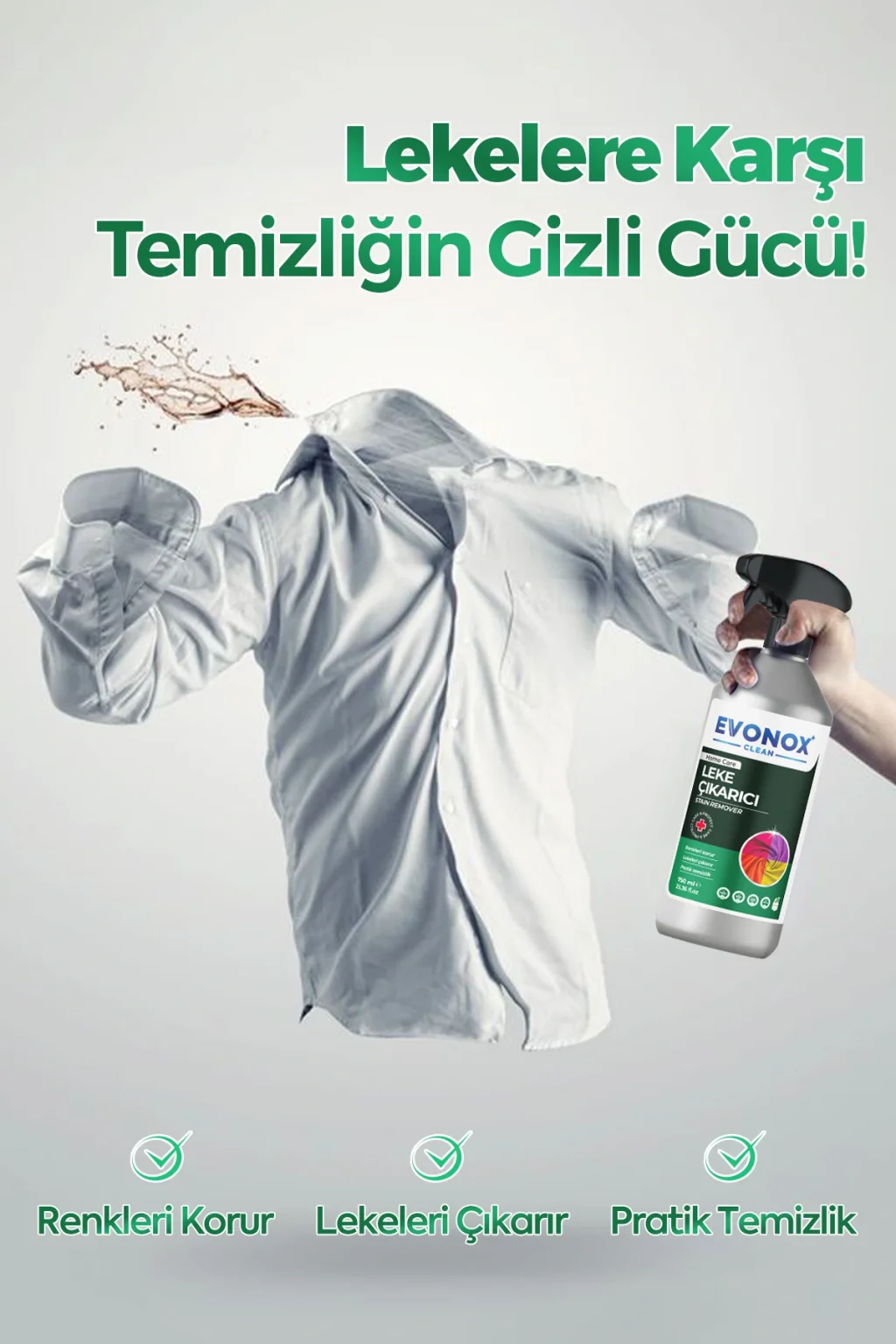 Renkleri korur.; ; Lekeleri çıkarır.; ; Pratik temizlik.; ; Ürünlerimiz sertifikalı ve Vegan'dır.; ; KULLANIM TALİMATI: Evonox Leke Çıkarıcı’yı kullanmadan önce, leke çıkarılacak alanın kuru olduğundan emin olun.; Ürünü çalkalayarak iyice karıştırın.; ; Doğrudan Uygulama: Evonox Leke Çıkarıcı’yı lekenin üzerine doğrudan püskürtün veya dökün.; Ürünün lekenin tamamını kapladığından emin olun.; ; Hassas Yüzeyler: Hassas yüzeyler veya kumaşlar üzerinde kullanmadan önce küçük, gizli bir bölgede test edin.; Ürünü uyguladıktan sonra 5-10 dakika bekleyin.; Bu süre, Evonox Leke Çıkarıcı’nın lekeye nüfuz etmesine ve etkili olmasına yardımcı olur.; Çok inatçı lekeler için bekleme süresini 15-20 dakikaya kadar uzatabilirsiniz.; ; Kumaş ve Giysiler: Bekleme süresinin ardından lekeyi hafifçe ovalayın.; Ardından lekeyi soğuk suyla durulayın veya lekeyi doğrudan çamaşır makinesinde yıkayın.; ; Yüzeyler: Sert yüzeyler (tezgah, fayans, mobilya vb.; ) üzerindeki lekeleri temiz bir bez veya süngerle silin ve ardından durulayın.; Çok inatçı lekeler için işlemi tekrar edin.; Gerekirse, Evonox Leke Çıkarıcı’yı uyguladıktan sonra bir fırça veya süngerle hafifçe ovalayarak lekeyi çıkarmaya çalışın.; Lekenin tamamen temizlendiğinden emin olduktan sonra, kumaşları veya yüzeyleri doğal olarak kurumaya bırakın.; ; Giysiler ve diğer tekstil ürünleri için, doğrudan güneş ışığına maruz bırakmadan kurumaya özen gösterin.; Ürünün lekeye direkt temas etmesi ve daha etkili olması için kullanırken trigerin köpük kısmını aktif etmemeniz önerilir.; ;