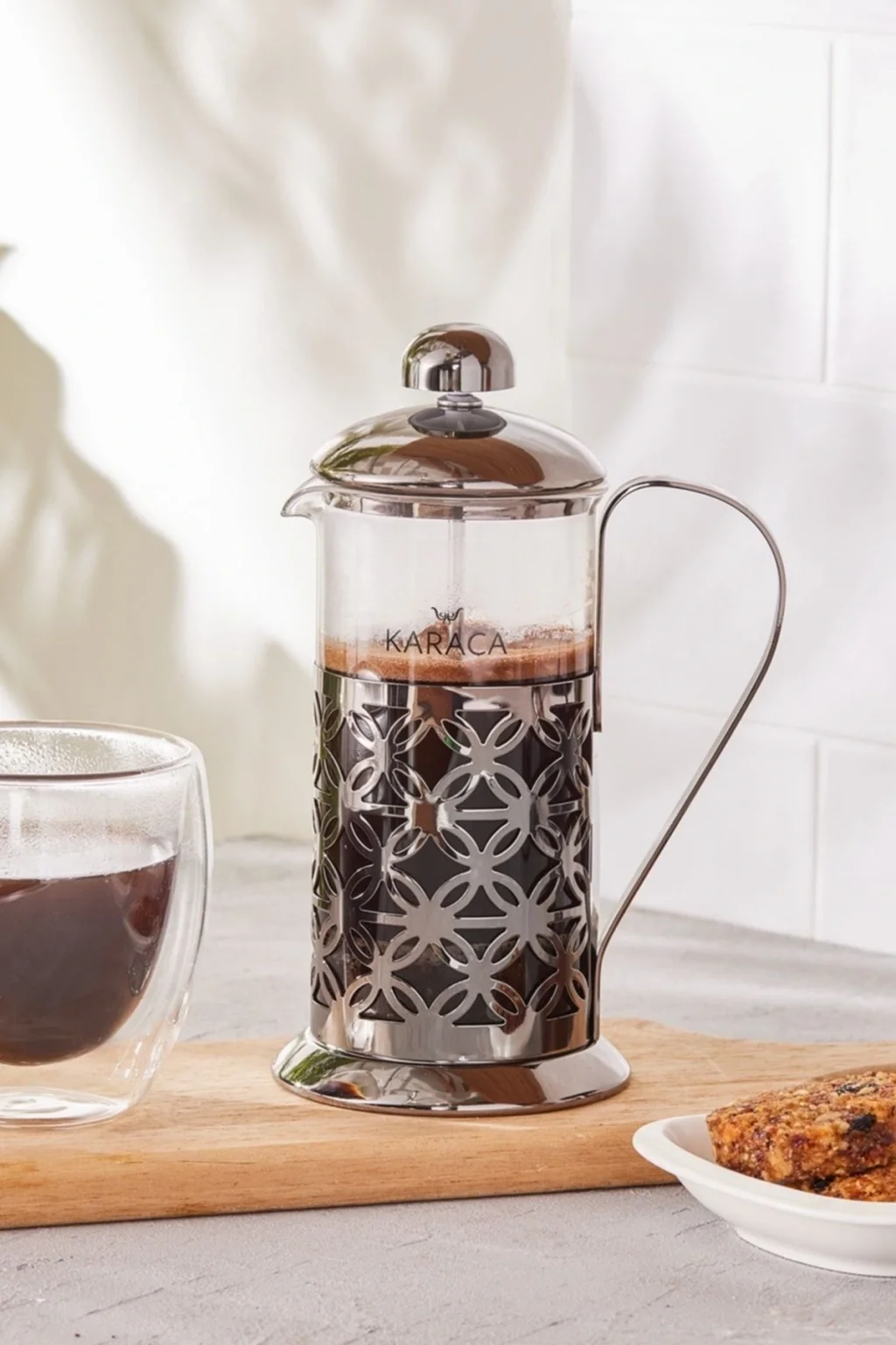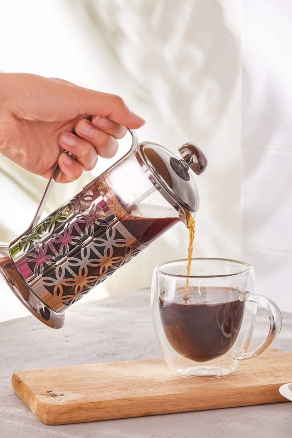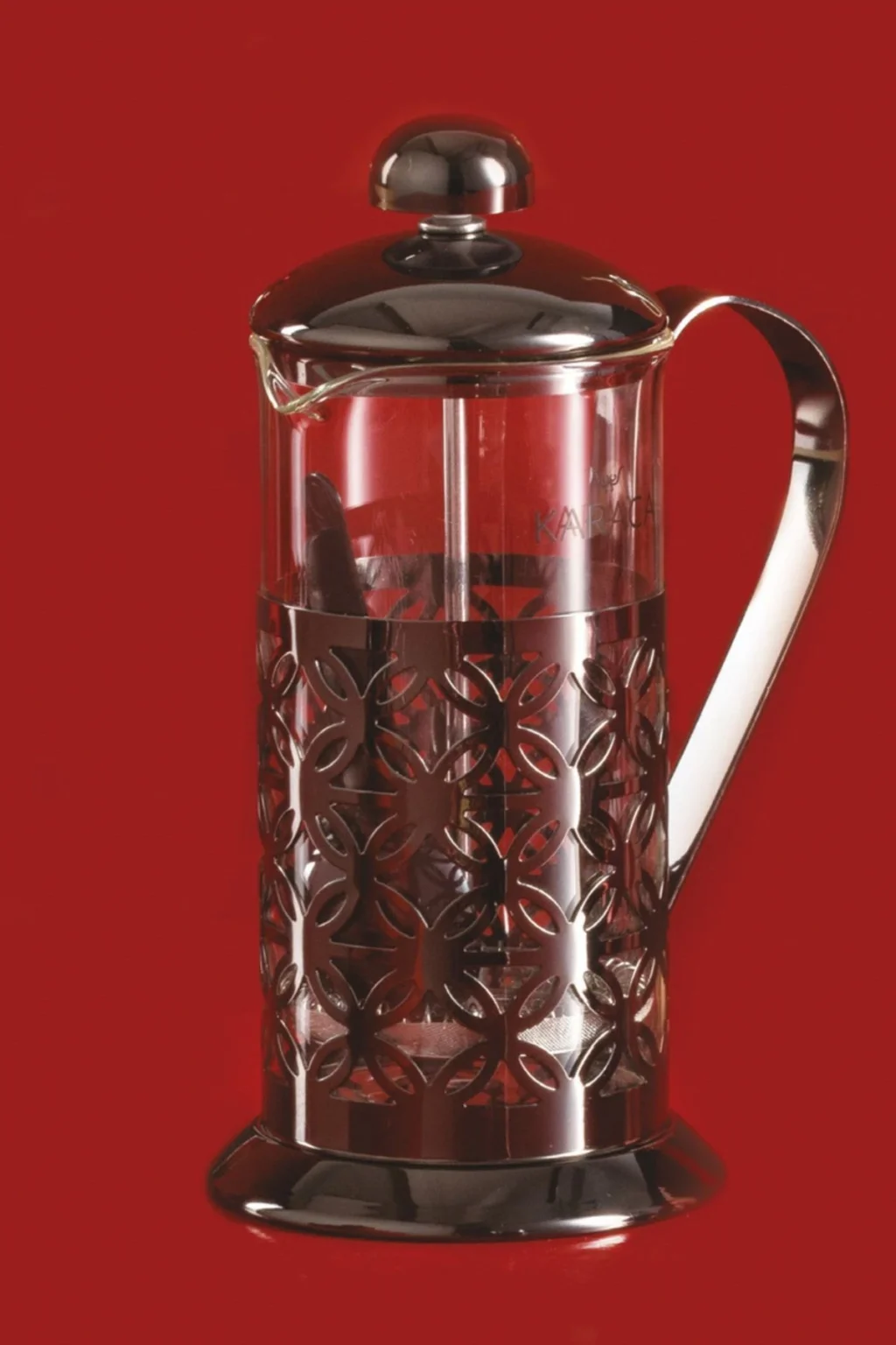 Karaca Coffee Bean Borosilikat Cam French Press Black Flower 350 Ml;Malzeme: Cam;Hacim: 350 ml;Bulaşık makinesinde yıkanabilir.;Kahve keyfine hızlıca ulaşın;Kahve içmek istediğinizde aradığınız lezzete ulaşmanın en hızlı yolu french press’tir.; Pratik ve doğru demleme yöntemiyle kahvenizin kalitesini ve aromasını korur.; Filtresi sayesinde ise pürüzsüz bir kahve keyfi sunar.;Bitki çayını ideal şekilde demleyin;Bitki çayı demleyeceğinizde de french press kullanabilirsiniz.; Demleme çubuğu, çay yapraklarının aromasını en iyi şekilde almanızı sağlar.; French press ile çayınızı uzun süre taze ve sıcak tutabilirsiniz.;Zarif ve dayanıklı tasarım;Borosilikat cam malzemesi sayesinde hem zarif hem dayanıklıdır.; Yüksek ısıdan ya da ısı değişimlerinden etkilenmez ve uzun ömürlüdür.;Kırılmalara karşı koruma kabı;Cam karafı çevreleyen koruma kabı, kırılmaları önler ve zeminlerle ısı temasını engeller.; Koruma kabı ile karaf birbirinden ayrılarak temizliğe hazır hale gelir.;Sökülebilir parçaları kolayca temizleyin;French press’inizin sökülebilir parçaları birbirinden ayrılarak zahmetsizce temizlenebilir.; Temizlik sonrasında parçaların birleşimini de kolayca yapabilirsiniz.