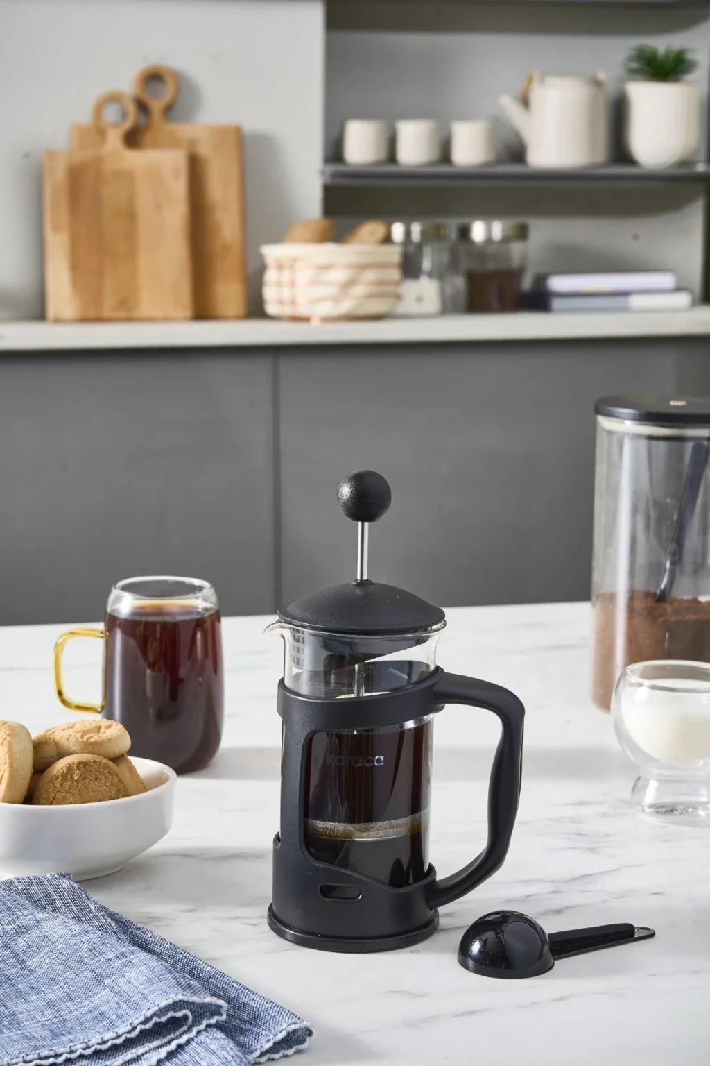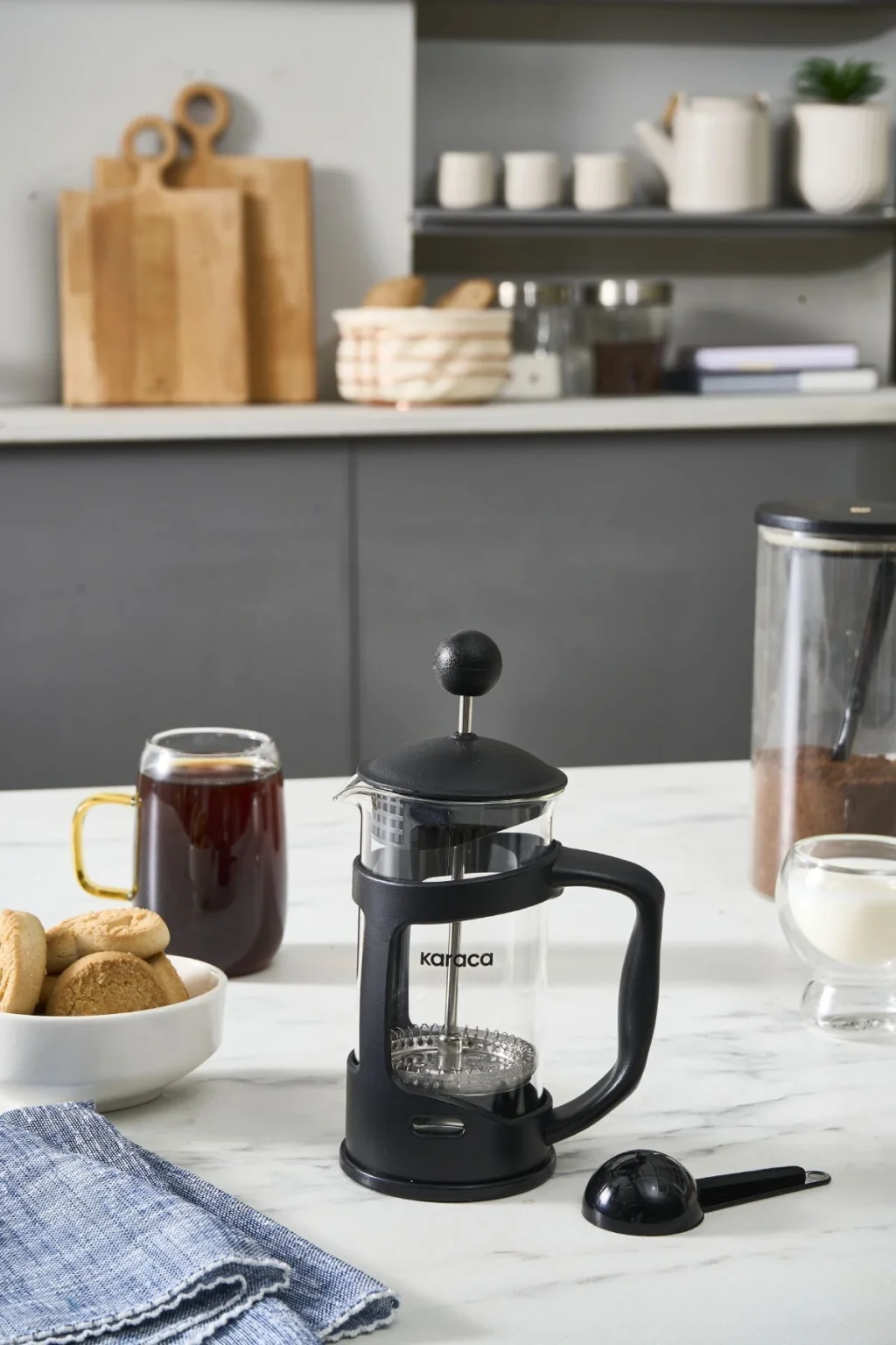 Karaca Coffee Bean Kaşık Hediyeli Borosilikat Cam French Press 350 Ml Siyah;Malzeme: Cam;Hacim: 350 ml;Kahve keyfine hızlıca ulaşın;Kahve içmek istediğinizde aradığınız lezzete ulaşmanın en hızlı yolu french press’tir.; Pratik ve doğru demleme yöntemiyle kahvenizin kalitesini ve aromasını korur.; Filtresi sayesinde ise pürüzsüz bir kahve keyfi sunar.;Bitki çayını ideal şekilde demleyin;Bitki çayı demleyeceğinizde de french press kullanabilirsiniz.; Demleme çubuğu, çay yapraklarının aromasını en iyi şekilde almanızı sağlar.; French press ile çayınızı uzun süre taze ve sıcak tutabilirsiniz.;Zarif ve dayanıklı tasarım;Borosilikat cam malzemesi sayesinde hem zarif hem dayanıklıdır.; Yüksek ısıdan ya da ısı değişimlerinden etkilenmez ve uzun ömürlüdür.;Kırılmalara karşı koruma kabı;Cam karafı çevreleyen koruma kabı, kırılmaları önler ve zeminlerle ısı temasını engeller.; Koruma kabı ile karaf birbirinden ayrılarak temizliğe hazır hale gelir.;Sökülebilir parçaları kolayca temizleyin;French press’inizin sökülebilir parçaları birbirinden ayrılarak zahmetsizce temizlenebilir.; Temizlik sonrasında parçaların birleşimini de kolayca yapabilirsiniz.