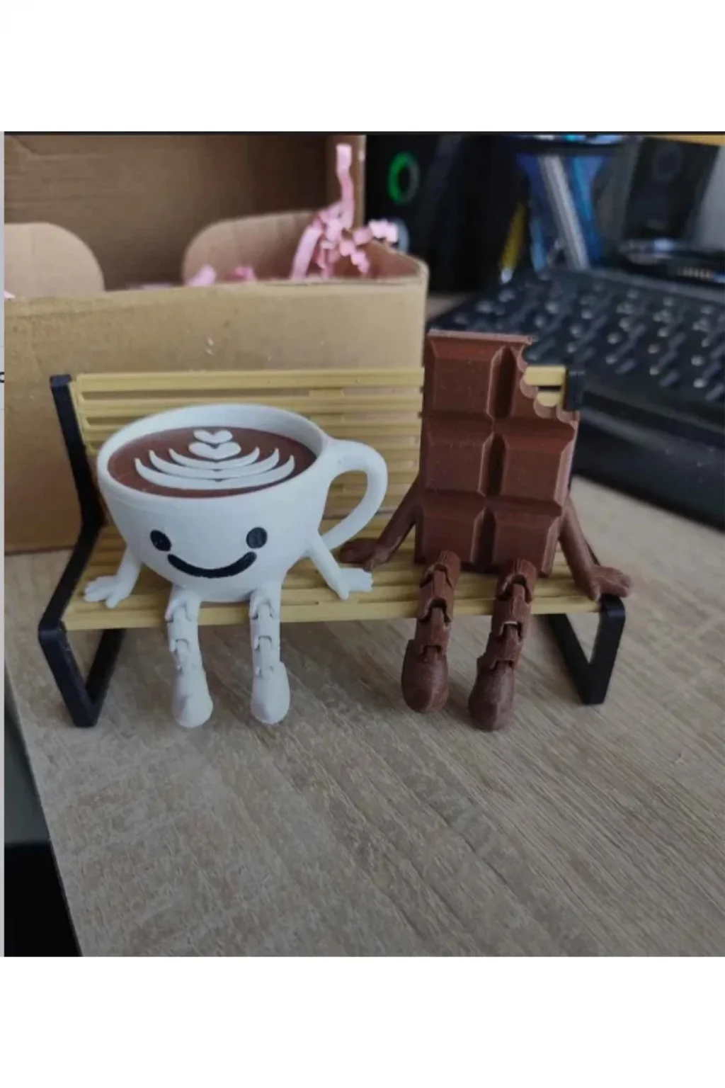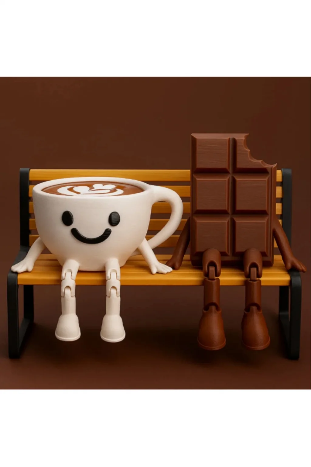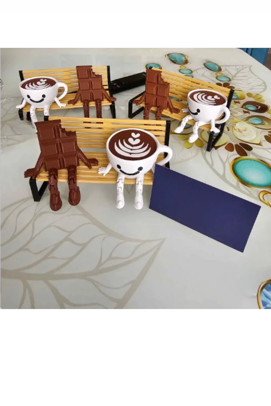Çok Sevimli Bank Üzerinde Çikolata Ve Espresso Biblo Seti / 3'lü Dekoratif Figür Hediyelik Çeyizlik