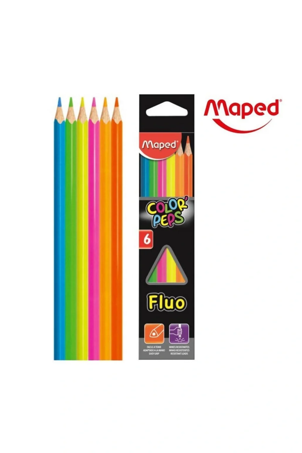 Maped Üçgen 6'lı Neon Kuru Boya Kalemi Özellikleri ve Açıklamaları Maped Üçgen 6'lı Neon Kuru Boya Kalemi 832003 6 renk içeren paket Karton kutu Dayanıklı ve yumuşak uç Ergonomik tutuş sağlayan üçgen kalem