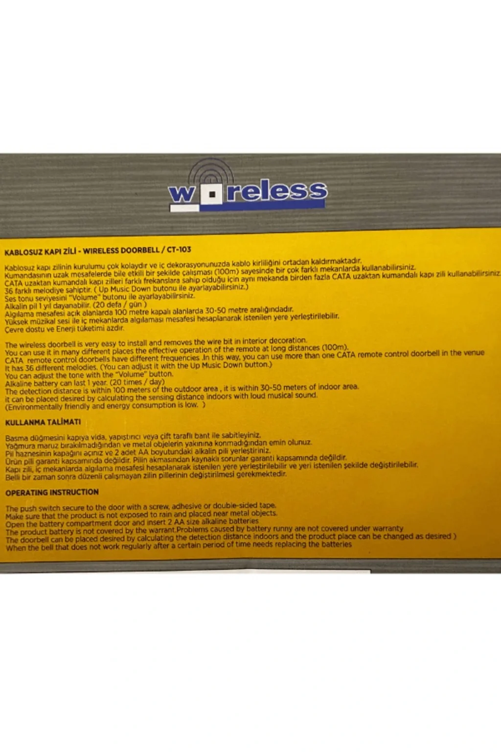 Cata CT-103 Kablosuz Kapı Zili (Gri Kenarlı) Özellikler 32 farklı melodi ; 100 metre açık alan, 50 metre kapalı alan menzili ; Kolay kurulum ve kullanım ; Farklı frekanslar ile aynı mekanda birden fazla kullanım ; Açıklama Cata CT-103 Kablosuz Kapı Zili, şık tasarımı ve pratik kullanımı ile ev, ofis ve diğer yaşam alanları için ideal bir seçimdir. 32 farklı melodi seçeneği ile her zevke hitap eden bir üründür. 100 metre açık alan, 50 metre kapalı alan menzili ile geniş bir kullanım alanına sahiptir. Kolay kurulumu ve kullanımı sayesinde kısa sürede kullanıma hazır hale getirilebilir. Farklı frekansları sayesinde aynı mekanda birden fazla Cata CT-103 Kablosuz Kapı Zili kullanılabilir. Avantajlar Kablosuz tasarımı ile dekoratif açıdan avantaj sağlar. ; 32 farklı melodi seçeneği ile her zevke hitap eder. ; 100 metre açık alan, 50 metre kapalı alan menzili ile geniş bir kullanım alanına sahiptir. ; Kolay kurulum ve kullanımı ile kısa sürede kullanıma hazır hale gelir. ; Farklı frekansları sayesinde aynı mekanda birden fazla kullanıma imkan verir. ; Kullanım Alanları Ev ; Ofis ; İşyeri ; Hastane ; Okul ; Kreş ; Ve daha fazlası ; Cata CT-103 Kablosuz Kapı Zili, şık tasarımı, pratik kullanımı ve geniş kullanım alanı ile ev ve işyerleriniz için ideal bir üründür.