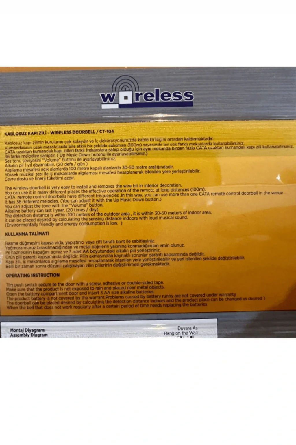 Cata CT-104 Kablosuz Kapı Zili (Gri) Özellikler: 32 farklı melodi seçeneği ; Ses tonu seviyesi ayarı ; 1 adet pil ile çalışır (Pil dahildir) ; Algılama mesafesi: açık alanda 100, kapalı alanda 30-50 metre ; Led ışıklı ; Açıklama: Cata CT-104 Kablosuz Kapı Zili, ev ve iş yerlerinde kolay ve pratik bir şekilde kullanım için tasarlanmıştır. 32 farklı melodi seçeneği sayesinde istediğiniz melodiyi seçebilir, ses tonu seviyesini ayarlayarak size en uygun sesi bulabilirsiniz. 1 adet pil ile çalıştığı için kurulumu ve kullanımı oldukça kolaydır. Açık alanda 100, kapalı alanda 30-50 metre algılama mesafesine sahiptir. Led ışıklı olması sayesinde geceleri de rahatlıkla görebilirsiniz. Avantajları: Kablosuz olduğu için kurulumu ve kullanımı kolaydır. ; 32 farklı melodi seçeneği ile istediğiniz melodiyi seçebilirsiniz. ; Ses tonu seviyesini ayarlayarak size en uygun sesi bulabilirsiniz. ; 1 adet pil ile çalışır. ; Açık alanda 100, kapalı alanda 30-50 metre algılama mesafesine sahiptir. ; Led ışıklıdır. ; Kullanım Alanları: Evler ; İş yerleri ; Ofisler ; Apartmanlar ; Villalar ;