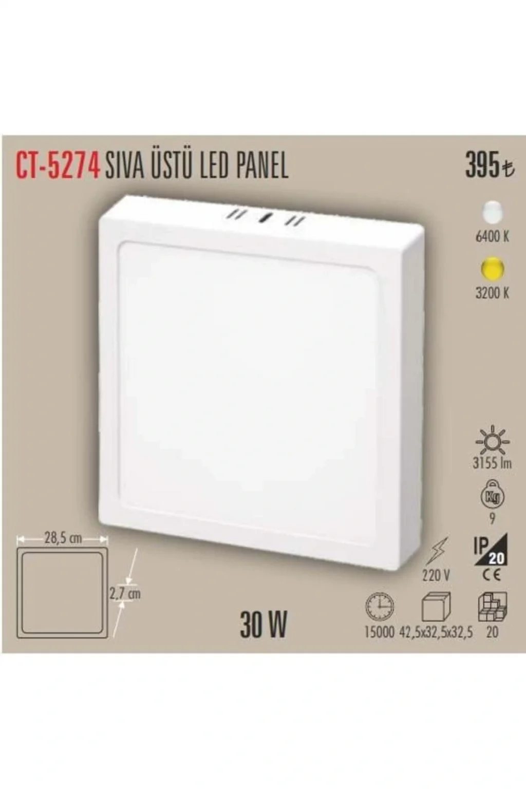 Genel Ürün CT-5274 30W Sıva Üstü KARE LED Panel – 6500K Beyaz Işık