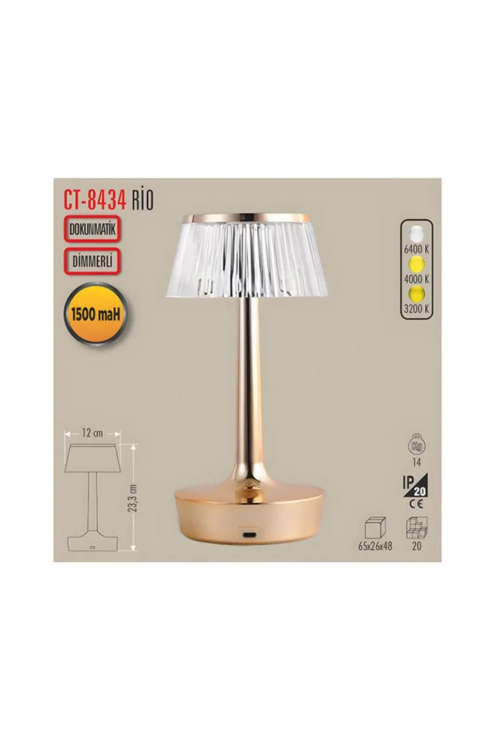 ⚙️ Ürün Özellikleri ? Renk: Gold? Güç: 2W? Gerilim: 5V DC, 1200 mAh? Renk Sıcaklığı: 6400K (Beyaz), 4000K (Gün Işığı), 2800K (Amber)? Işık Akısı: 74 lm (Beyaz), 100 lm (Gün Işığı), 20 lm (Amber)? Koruma Sınıfı: IP20 - Class III? Işık Açısı: 60°⚡ Beyan Akımı: 0.03A⏳ Ürün Ömrü: 15.000 Saat?️ Çalışma Sıcaklığı: -20°C / +40°C? Şarj Süresi: 3-4 Saat? Yanma Süresi: 6 Saat⚙️ Kontrol: Dokunmatik tek anahtar ile 3 yanma modu? Dimmer Özelliği: Dim edilebilir, ışık seviyesi ayarlanabilir ? Öne Çıkan Özellikler ✅ 3 farklı ışık modu: Beyaz, Gün Işığı ve Amber✅ Dimmer özelliği ile istediğiniz ışık seviyesini ayarlayın✅ Şarjlı kullanım ile kablo derdine son✅ Şık gold kasa tasarımı✅ Dokunmatik kontrol ile kolay kullanım✅ Portatif ve kompakt tasarım, masa üstü veya taşıma için ideal ? Kullanım Alanları ? Okuma, çalışma veya yazı yazma gibi aktiviteler?️ Ofis masası, çalışma alanları için ideal?️ Gece lambası olarak başucu kullanımı? Modern tasarımıyla hediye olarak da mükemmel seçenek