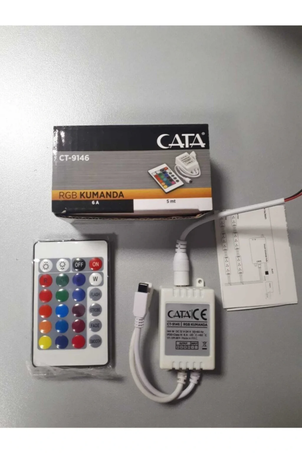 ÜRÜN ADI : CATA CT; 9146 RGB KUMANDA 5 MT GÜÇ 144W GERİLİM : DC12 V; 24 V FREKANS : 50; 60 Hz KORUMA SINIFI : IP20; Class III BEYAN AKIMI : 6 A ÇALIŞMA SICAKLIGI :; 20 C +60 C;