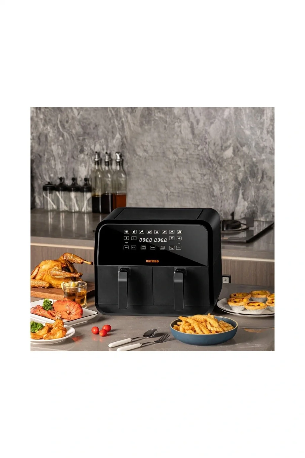 - D8 dokunmatik ekranı sayesinde, kolay ve hızlı bir şekilde sıcaklık ayarı yapabilir, pişirme süresini kontrol edebilirsiniz; - 4+4 adet geniş haznesi ile aynı anda birden fazla yiyeceği sağlıklı bir şekilde pişirebilirsiniz; - Yağsız pişirme teknolojisi ile yağsız ve sağlıklı yemekler hazırlayarak kalori alımınızı azaltabilirsiniz; - 1700 watt gücündeki yüksek performanslı motoru ile hızlı ve eşit ısı dağılımı sağlayarak mükemmel sonuçlar elde edersiniz;
