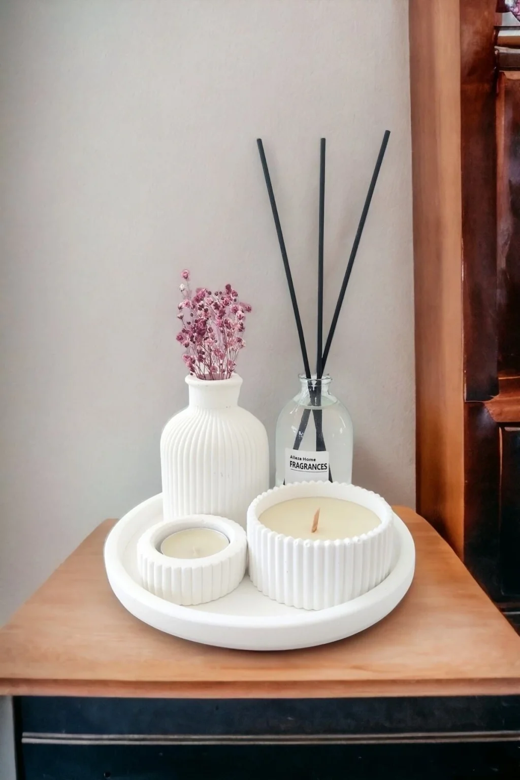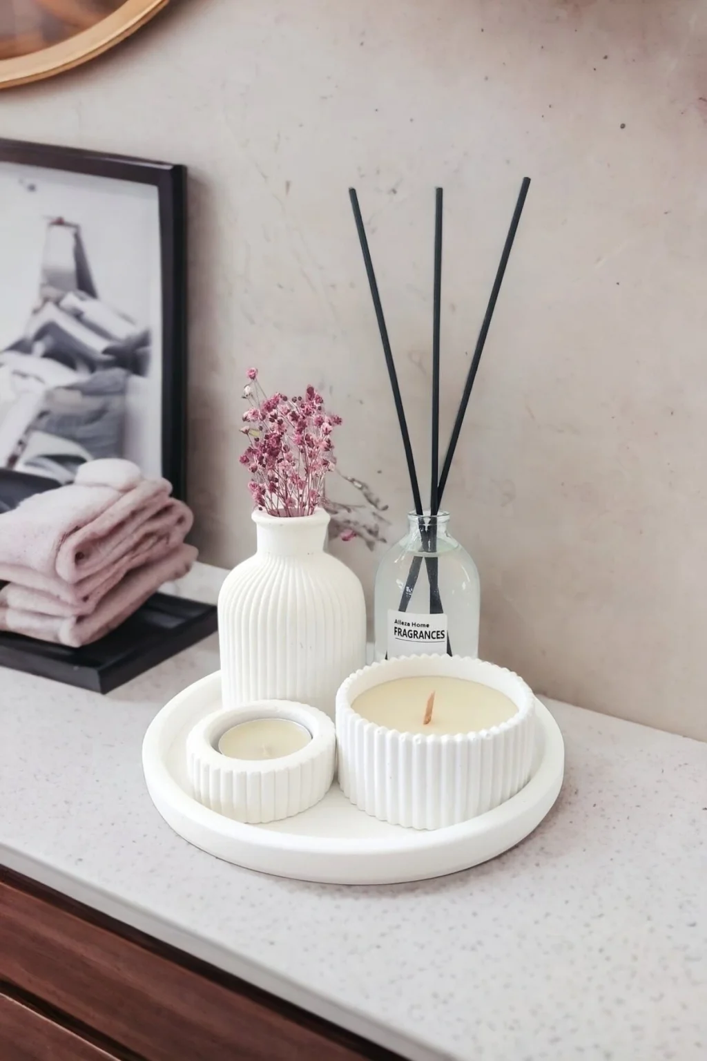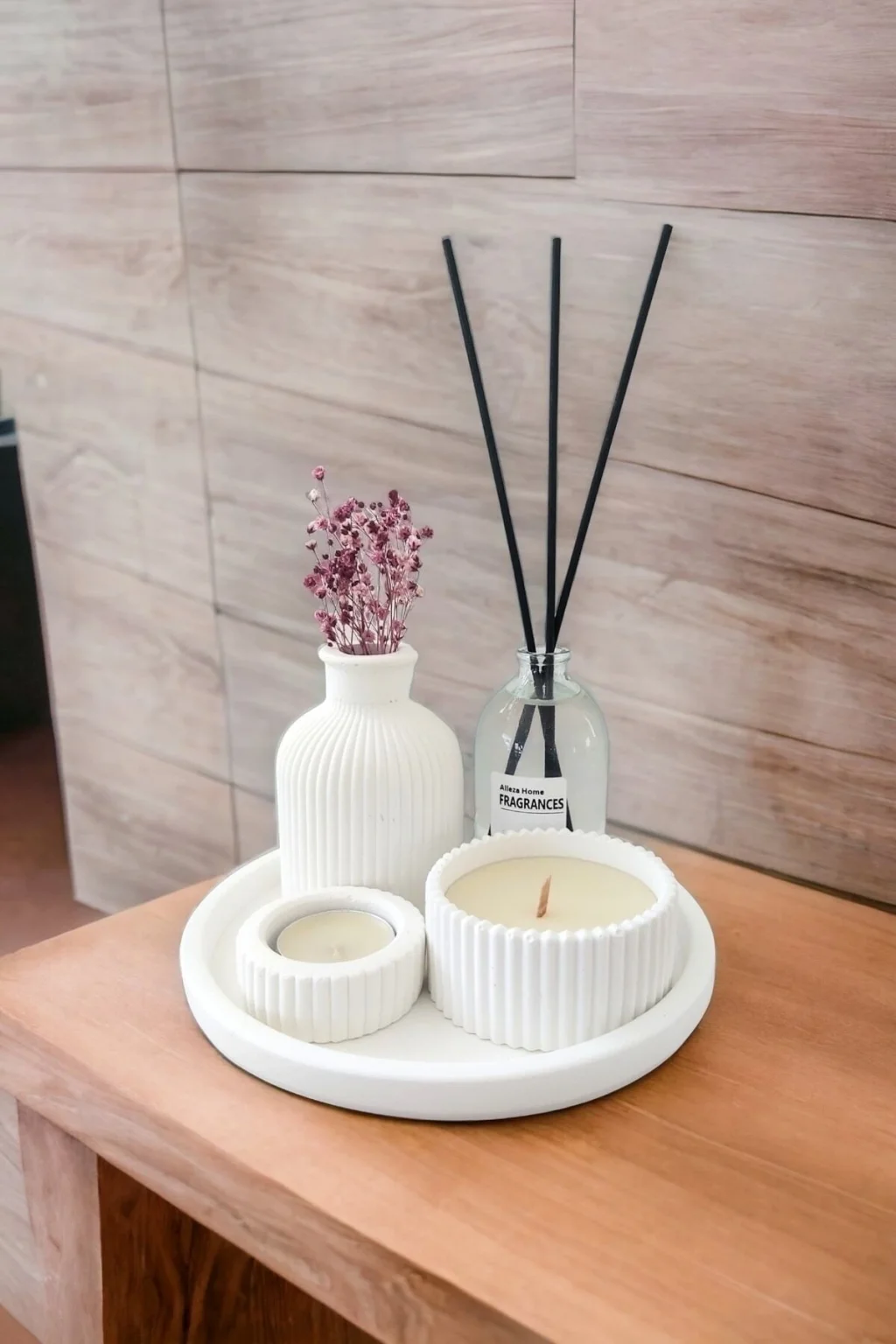 - Modern tasarımıyla evinizin dekorasyonuna şıklık katan beton vazo, minimalist çizgili deseniyle dikkat çeker; - Beton malzemesi sayesinde dayanıklı ve uzun ömürlü kullanım sunar; - Soft koku yayan tealight mum ile birlikte gelen bu set, hem göze hitap eder hem de hoş bir koku deneyimi sağlar;