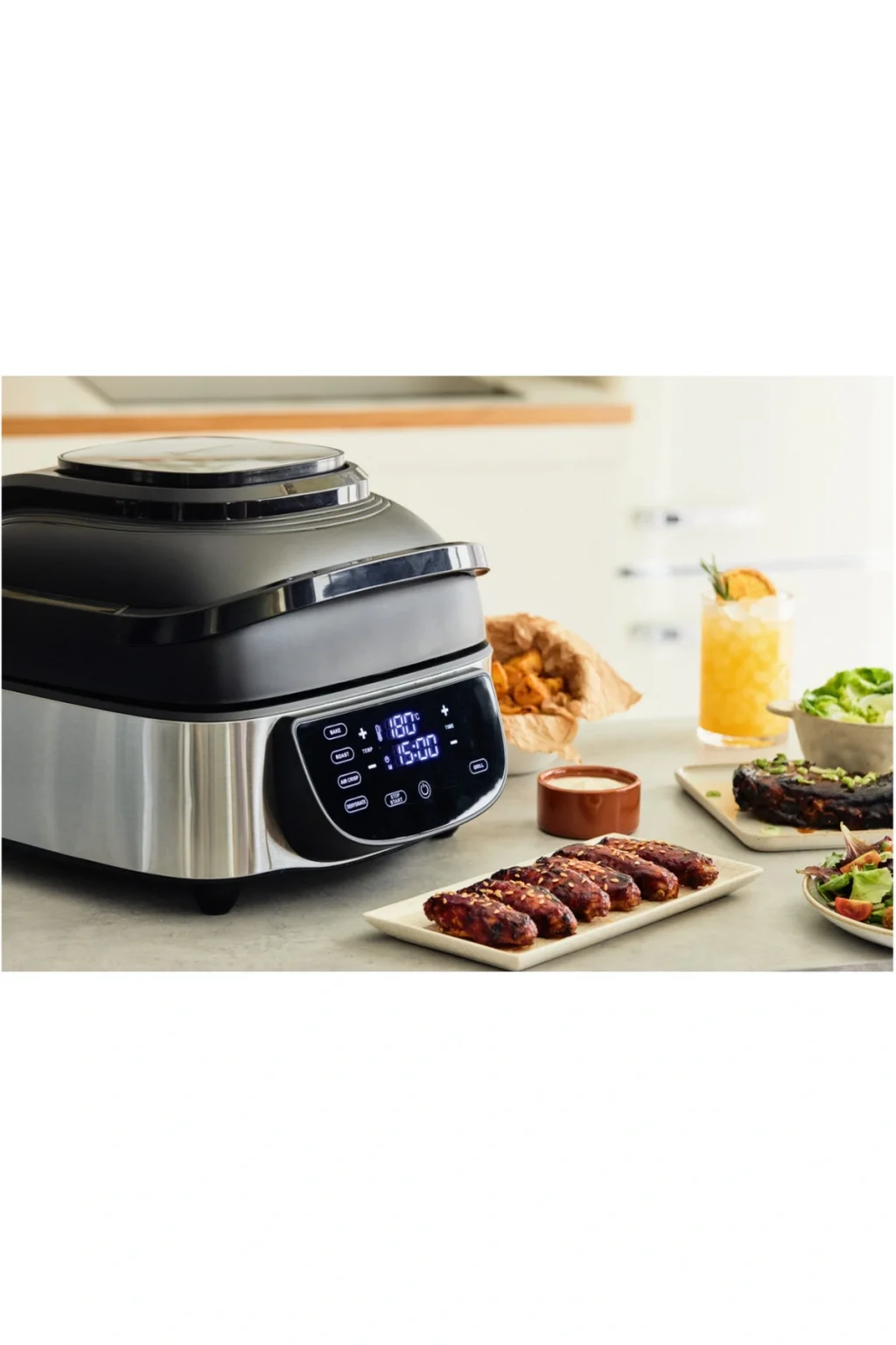 MasterPro Comet 700 Dumansız Elektronik Izgara ile evinizin konforunda mangal ve barbekü yapabilir, birbirinden lezzetli yemekler hazırlayabilirsiniz. ; 5'i 1 arada özelliği sayesinde, tek makinede pişirme, ızgara yapma, kızartma, sıcak hava ile pişirme (airfry) ve kurutma fonksiyonları bulunur. ; Dijital LED ekranı üzerindeki dokunmatik panelinden istediğiniz pişirme modunu, sıcaklığını ve süresini kolaylıkla ayarlayabilirsiniz. ; Et pişirirken akıllı probu ile sıcaklığını ölçebilirsiniz. ; 250ºC dereceye kadar ısınabilmesine rağmen dış gövdesi ısınmaz. ; Yüksek performanslı 1800W motor gücüne, ergonomik tasarıma ve aile boyu 7L ekstra geniş yapışmaz hazneye sahiptir.;