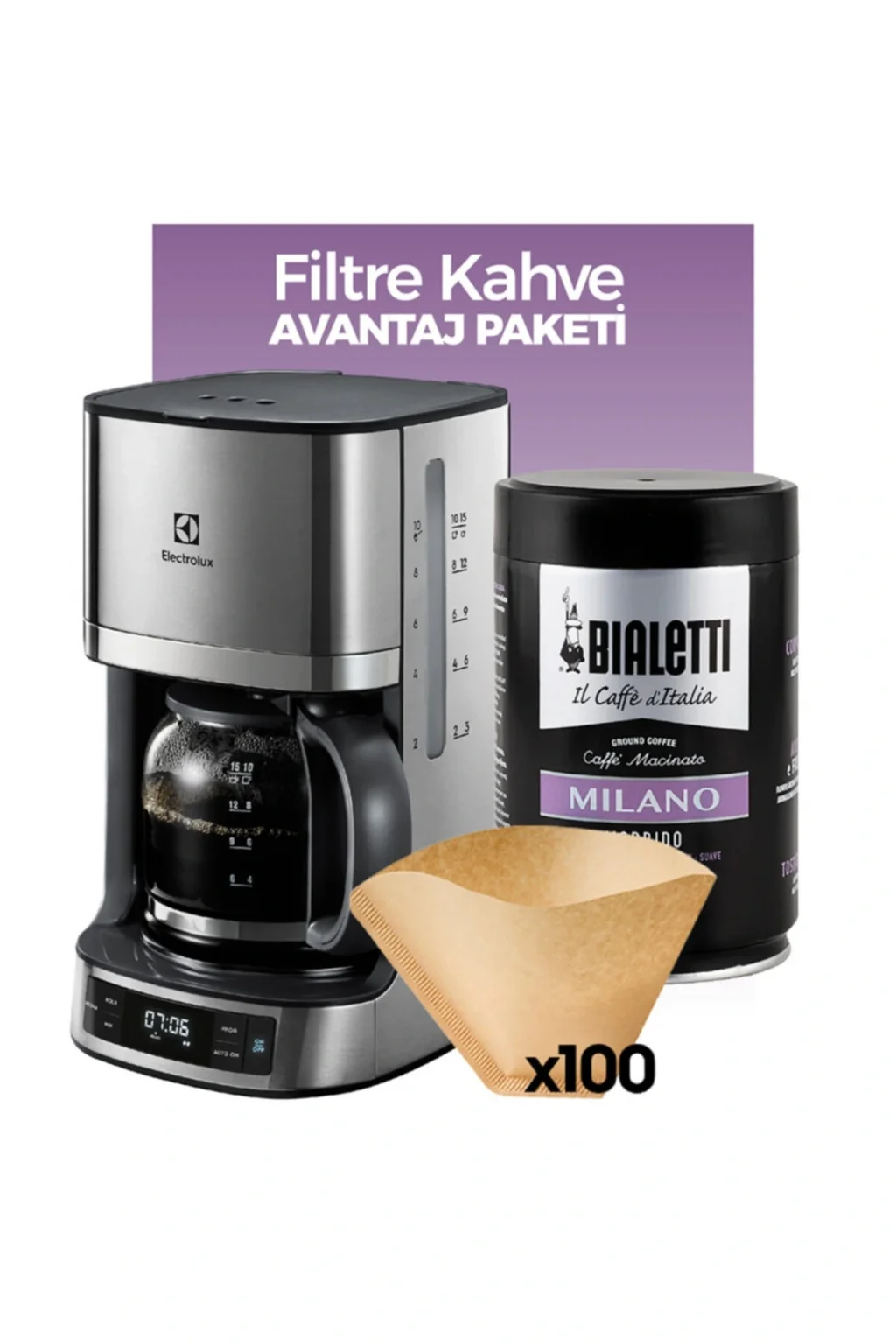 Electrolux EKF7700 7000 Serie 1080 W Aroma ve Zaman Ayarlı Filtre Kahve Makinesi; Akşamdan demle süresini ve kahvenin sertliğini ayarlayın, sabah taze demlenmiş kahve kokusu ile uyuyabilirsiniz; Programlanabilir zamanlayıcı, demleme süresini 24 saat önceden ayarlamanıza olanak tanır; Tek fincan kahve yapıyor olsanız bile aroma ayarı ile daha güçlü aromalı bir kahve yapmak için tercihinize göre demleme süresini de uzatabilir; Su seviyesi ve kahve dozu göstergesini kullanarak ister 2 ister 10 fincan kahve yapın, her zaman doğru ölçüyü kullandığınızdan emin olursunuz; Kahve makinesini açmayı unutsanız bile, 40 dakika sonra otomatik olarak kapanacağına güvenebilirsiniz; Bialetti Caffe Roma Koyu Kavrulmuş 250 gr Moka Pot & Filtre Kahve • İçerik: 250 gr Koyu Kavrulmuş Moka Pot & Filtre Kahve • Yoğun aromalı, göze çarpan çikolata, kuruyemiş, kuru meyve notalarına ve pürüzsüz bir dokuya sahip bir Bialetti klasiği; • Roma Moka, koyu kavrulmuş yüksek kaliteli Arabica ve Robusta'nın 50:50 karışımıdır; • Yoğunluk Derecesi: 10 üzerinden 9 • Kullanım Bilgisi: Filtre kahve makineleri, french press ve moka pot ile hazırlayabilirsiniz; • Koruyucu atmosferde paketlenmiştir; • Serin, kuru ve güneş almayan yerde muhafaza ediniz; • Ürün bileşenlerine alerjisi olanlar kullanmamalıdır; • Tavsiye edilen tüketim tarihi ambalajın üzerindedir; Alkol içermez;