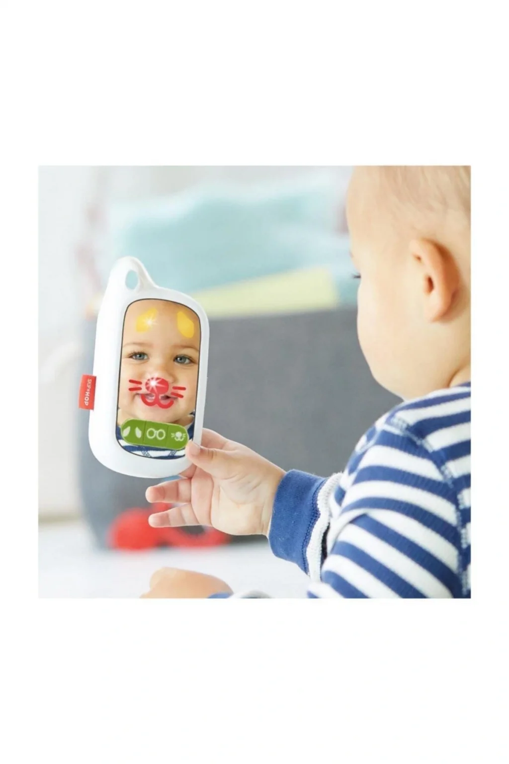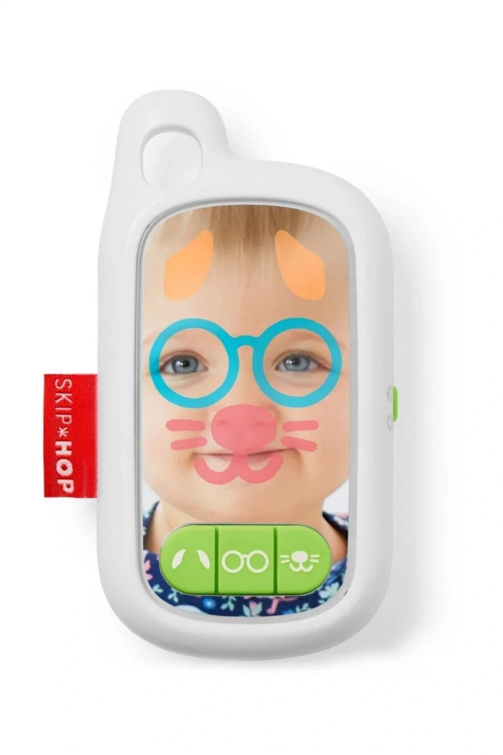 Bebeğinizin ilk özçekimi! Bu sevimli oyuncak telefon, aynalı yüzeyi sayesinde oyun zamanlarında bebeğinizin kendini tanımasını teşvik eder.; ; Komik gözlüklerden sevimli köpek kulaklarına kadar üç ışıklı yüz filtresi miniklerin keşfetmesi için oldukça eğlencelidir.; ; Havlamalar, miyavlamalar gibi harika ses efektleri ve neşeli melodiler eğlenceli anları artırır.; ; Özellikleri: -6 ay üzeri için uygundur -Aynalı ön yüzyüz filtreleri, sesler ve şarkılar için düğmelere basın.; Üç ışıklı yüz filtresi: köpek kulakları, gözlük ve bıyıklı kedi üç eğlenceli ses efekti: havlama, miyavlama ve merhaba efekti üç adet Skip Hop şarkısı antenli kısım, ürünü oyuncak halkası ile bebek arabasına takmanızı sağlar.; ; -Ürüne dahil değildir.; ; -Ftalat içermez -Çalışması için 3 adet AAA pil gerekir -Ürüne dahildir -Ölçüleri: Uzunluk: 10,6 cm Genişlik: 4,4 cm Yükseklik: 13,3 cm -Üretim yeri: ÇİN;
