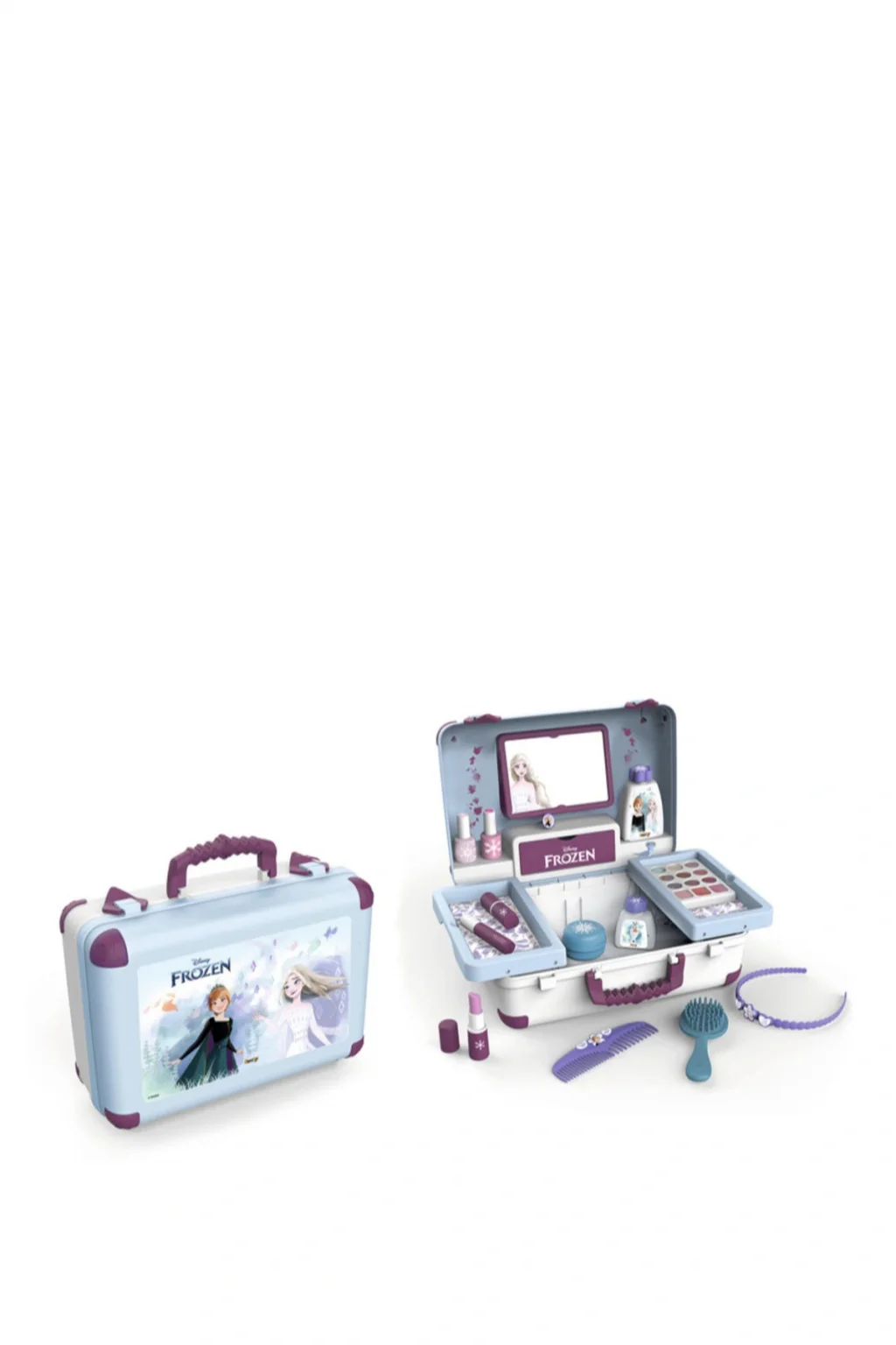 "Smoby Frozen My Beauty kozmetik çantası, çocuğunuzun güzellik bakımı için ihtiyacı olan her şeyle dolu Saç model tasarlamak için aksesuarlar(tarak gibi), tırnak salonu veya makyaj olsun, arzulanan her şey ellerinde olacak! 13 aksesuarın tamamı (aksesuar oyuncak kozmetik) bir taşıma kulplu çantanın içinde bulunur ve her yere götürülebilir: 2 oje, 2 ruj, göz farı paleti, maskara, fırça, tarak, saç bandı, yüzük ve çeşitli şişeler gibi aksesuarlar içermektedir(aksesuarlar çocukların sağlığı düşünülerek işlevsiz olarak üretilmiştir Boyama vb gibi fonksiyonları yoktur) Kilit özelliği sayesinde çanta kolaylıkla kapanır ve güvenle taşınır Ayrıca çantada bir ayna ve gizli bir bölme bulunuyor, daha fazla kozmetik malzemesine yer açmak için içindeki bölme rafları ayarlanabiliyor Fransa'da yüksek kaliteli malzemeden üretilmiştir Ürün boyutları: 35,5 x 28,6 x 28,5 cm 3 yaş ve üzeri çocuklar için uygundur