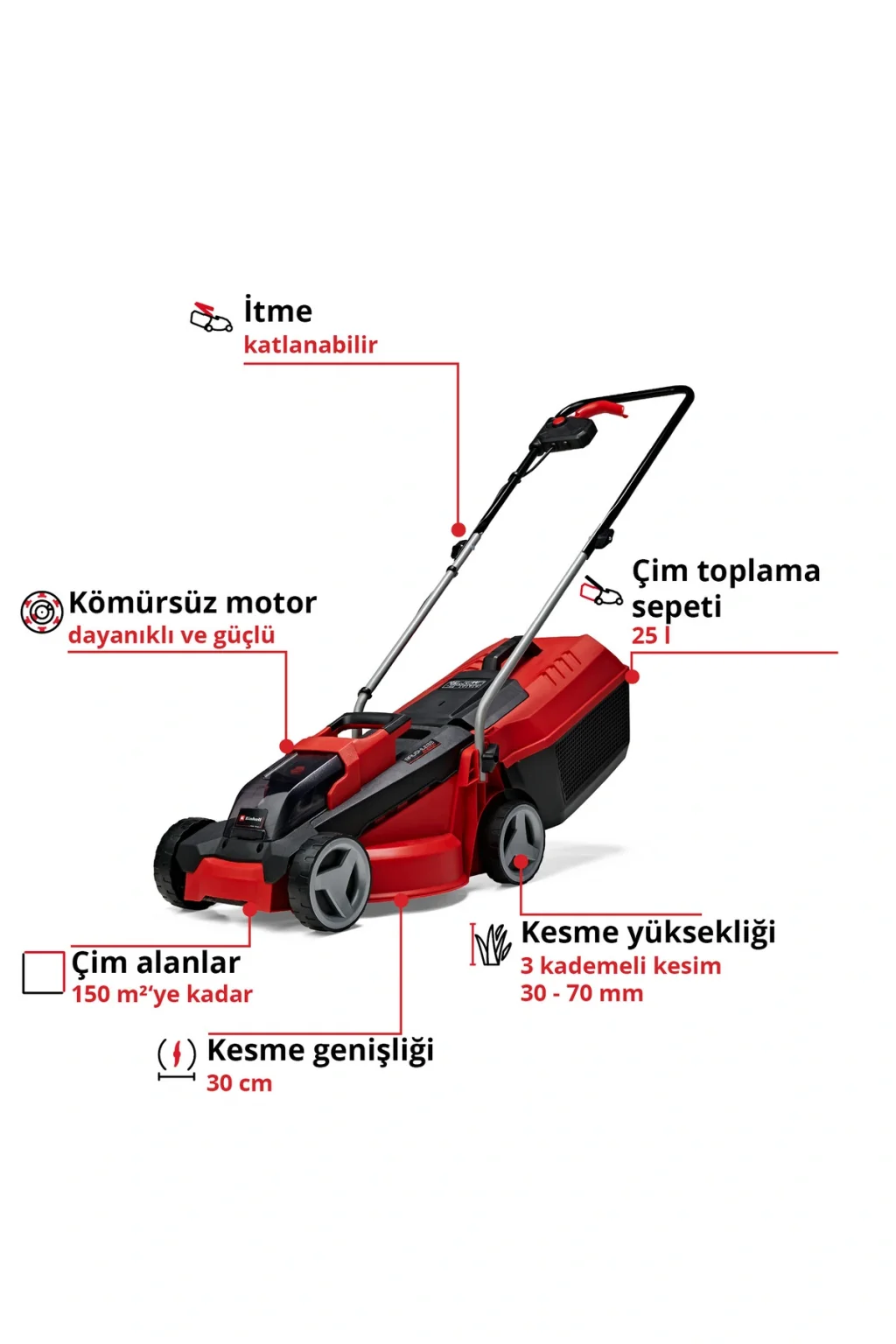 PurePOWER Kömürsüz – Bakım gerektirmeyen güçlü kömürsüz motor, geleneksel kömürlü motorlara kıyasla daha uzun çalışma süresiyle maksimum performans sağlar.;30 mm ile 70 mm arasında 3 kademeli kesim yüksekliği ayarı ile esnek kullanım imkânı sunar.;Çim dostu tekerlekler, engebeleri aşmak için idealdir ve kesim kenarlarında hassas çalışma yapmanızı sağlar.;Katlanabilir gidon yerden tasarruf sağlayan depolama seçeneği sunar. Taşıma kolu, hafif çim biçme makinesinin taşınmasını kolaylaştırır.;25 litrelik sahip çim toplama haznesine sahiptir.;Power X-Change: Tüm cihazlar için tek akü! Sistem serisindeki tüm aküler, tüm Power X-Change cihazlarıyla kullanılabilir.;Akülü çim biçme makinesi, teslimat kapsamına dahil olan 18 V 3,0 Ah lityum iyon akü ile çalışır. Uygun şarj cihazı da teslimata dahildir.;Einhell GE-CM 18/30 Li akülü çim biçme makinesi, bahçeyi hızlı bir şekilde şekillendirmeye yardımcı olur - güçlü, bağımsız, kablosuz ve çevre dostu. Akülü çim biçme makinesi 150 m²'ye kadar olan çimler için tavsiye edilir. Power X-Change teknolojisi sayesinde çim biçme makinesi, sistem serisindeki herhangi bir cihazda kullanılabilen güçlü bir 18 V / 3,0 Ah lityum iyon şarj edilebilir akü ile çalışır. Akü, çim biçme makinesine 30 cm kesme genişliği ile 3.500 dev/dak'ya kadar hız sağlar. Üç LED'li bir akü şarj seviyesi göstergesi, kalan gücü sürekli olarak izlemeyi kolaylaştırır. Cihaz Einhell PurePOWER kömürsüz motor ile güçlendirilmiştir. Bu kömürsüz motor geleneksel karbon fırçalı motorlara göre daha fazla güç ve daha uzun çalışma süresi sunar. Online kayıt olduktan sonra kömürsüz motor 10 yıl garanti ile gelir. Pratik biçme için 3 kademeli eksenel kesme yüksekliği ayarlama olanağı vardır. Katlanabilir uzun sap, minimum alanda depolama sağlar. Kolay taşıma için entegre bir taşıma kolu vardır. Çim toplama sepeti 25 litre kapasiteye sahiptir. Büyük tekerlekler çim biçme sırasında çime daha az baskı uygular. Ürün, bir PXC şarj edilebilir akü ve bir sistem şarj cihazı ile birlikte verilir.;Bu ürün, Einhell Türkiye garantisi altındadır. Teknik destek talepleriniz için +90 216 456 60 60 numaralı telefondan Einhell Türkiye Müşteri Hizmetleri’yle iletişime geçebilir, garanti koşulları ve tarafınıza sunulacak ek garanti süresi avantajlarına linki aracılığıyla ulaşabilirsiniz.