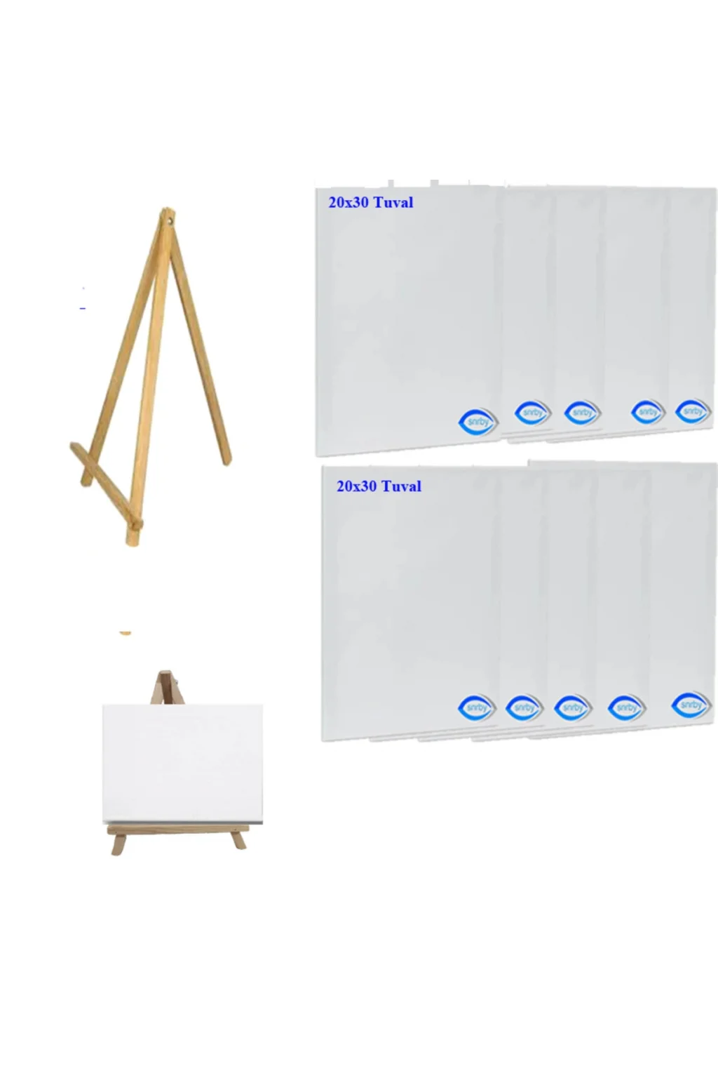 YERLİ ÜRETİM *10 Adet 20x30 Cm Tuval+1 Adet (Kayın,Çam,Köknar)Ağacından Şövale (Ekonomik Set) *20X30 Cm Tuval *Çam Ağacın dan Ahşap Çerçeve *Çift Gesso Tuval Bezi