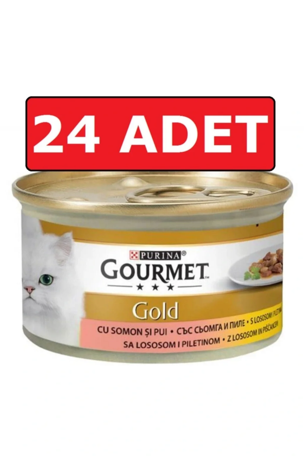 Purina gourmet gold somonlu ve tavuk etli kedi konservesi 24 adet 85 gr parça etli yaş mama; ; Yaş kedi maması, özenle pişirilmiş, parça etli, daha yoğun bir lezzet amacıyla özel sos eşliğinde hazırlanmış, somonlu ve tavuklu, konserve kedi maması.; ; Yaş Kedi Mamasının İçeriği;; Et ve et türevleri (% 4 tavuk eti), tahıllar, balık ve balık türevleri (% 4 somon balığı), çeşitli şekerler, mineraller.; ; Konserve Kedi Mamasının Analizi;; Ham protein % 7,5, ham yağ, % 3,7, ham selüloz % 0,5, nem % 81,5, ham kül % 1,3, A vitamini 1290 IU, D3 vitamini 200 IU, demir 9 mg, iyot 0,20 mg, bakır 0,80 mg, mangan 1,70 mg, çinko 9 mg.; ; Kedi Beslenme Tavsiyesi;; * 4 kg vücut ağırlığına kadar olan yetişkin kediler için, iki ayrı öğün olarak günde 3 - 4 kutu ile beslenmesi tavsiye edilmektedir.; * Hamile ve süt veren kediler için, yiyebildiği kadar verilmesi tavsiye edilmektedir.; ; * Taze içme suyunu daima yaş kedi mamasının yanında bulundurunuz.; * Oda sıcaklığında muhafaza ediniz. Açıldıktan sonra buzdolabında muhafaza edilmeli ve maksimum 3 gün içersinde tüketilmelidir.;
