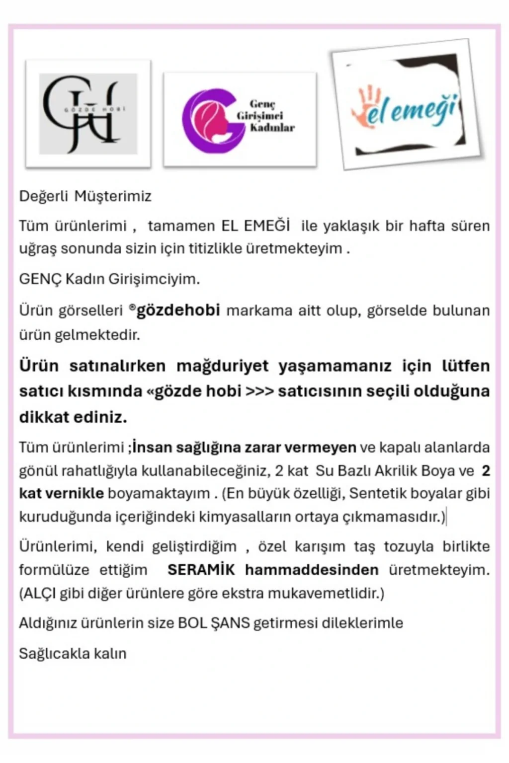 Minimal dekoratif objelerdir.; Küçük dekoratif amaçlı kullanılır.; Kuru bez ile temizlenebilir.; Boyları 8 10 cm şirin objelerdir.; Hammaddesi özel geliştirdiğimiz formülle taş betondur.; ALÇI DEĞİLDİR!.; ; İKİ KAT BOYA VE 2 KAT VERNİK UYGULAMAKTAYIZ Bu ürünün orijinal üreticisi ve satıcısı Gözde Hobidir.;