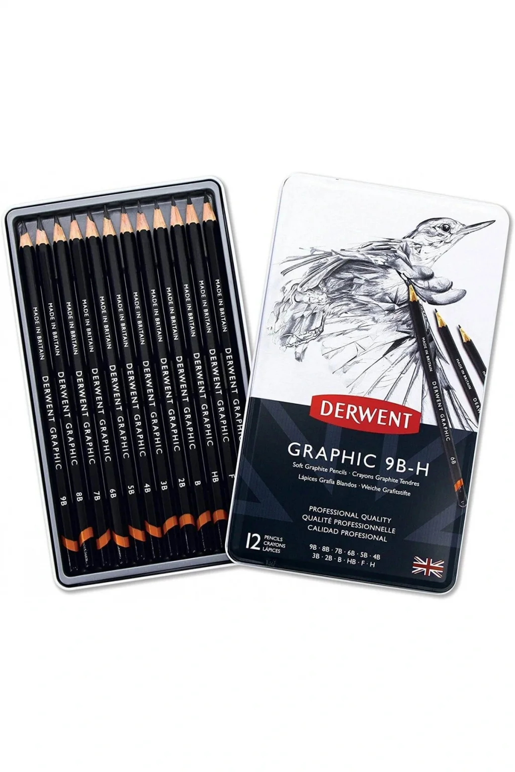 Profesyonel kalitede yumuşak grafit kalemler.; Her yaştan profesyonel sanatçılar ve amatörler için mükemmeldir.; ; İnce detaylı çizimler veya çiziminize gölge ve doku eklemek için idealdir.; ; Yuvarlanmayı önleyici altıgen gövde, standart kalemtıraş makinelerine uyar ve daha fazla hassasiyet ve kontrol sağlar, Uzun süreli kullanım için kolay keskinleştirilebilir ve kırılmaya karşı dayanıklıdır.; ; Masanızda yer kaplamadan kalemlere kolay erişim için çıkarılabilir kapaklı çekici metal kutu.; Derece numaraları beyaz ile kabartma yazılmıştır.; ; İçindekiler: 1x Set 12 Graphic Yumuşak Grafit Kalemi (6B, 5B, 4B, 3B, 2B, B, HB, F, H, 9B, 8B ve 7B), 34215;